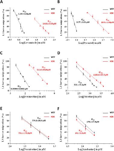 Fig. 3. Determination of the dose response relationships for levamisole (A); pyrantel (B); ivermectin (C); nicotine (D); nornicotine (E) and anabasine (F) on H. contortus L3 larvae using the automated larval migration assay (ALMA). Results are shown as the mean ± se from 3 distinct ALMA assays performed with 7500 H. contortus L3 larvae from the Weybridge isolate (in black) or Kokstad isolate (in red). IC50 values are indicated on the graphs. (For interpretation of the references to colour in this figure legend, the reader is referred to the Web version of this article.)