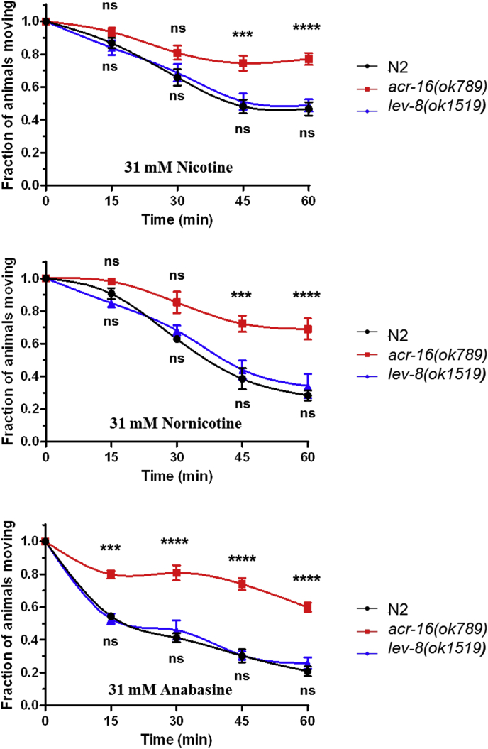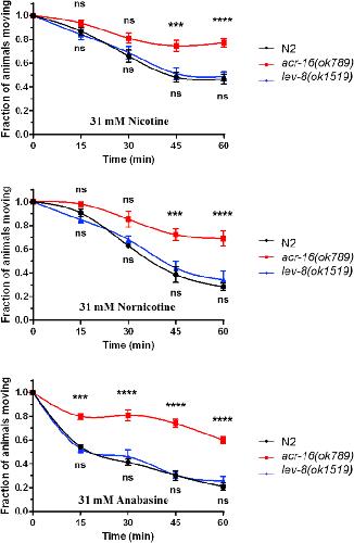 Fig. 4. Effects of nicotine, nornicotine or anabasine on the motility of C. elegans. Paralysis assays were performed on N2, acr-16 (ok789) and lev-8 (ok1519) C. elegans strains in agar plate containing 31 mM of nicotine (A), nornicotine (B) or anabasine (C) after 15, 30, 45 and 60 min drug exposure. Paralysis was scored based on the absence of worm's movement in response to prodding. Data are the mean ± SEM of n = 12, ****p < 0.0001, ***p < 0.001, **p < 0.01 and *p < 0.05, one way ANOVA with Bonferroni post-hoc test between N2 and the mutant strains.