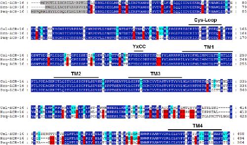 Fig. 5. Amino-acid alignments of ACR-16 subunit sequences from Caenorhabditis elegans, Haemonchus contortus and Parascaris equorum. acr-16 deduced amino-acid sequences were aligned using the MUSCLE algorithm (Edgar, 2004) and further processed using GeneDoc. Predicted signal peptide sequences are shaded in grey. Amino acids conserved between all the ACR-16 sequences are highlighted in dark blue. Amino acids specifically shared by ACR-16 homologs from parasitic species are highlighted in red. Amino acids specifically shared by Clade V nematode species (C. elegans and H. contortus) are highlighted in light blue. The cys-loop, the four transmembrane regions (TM1–TM4) and the primary agonist binding (YxCC) are indicated above the sequences. Cel (Caenorhabditis elegans), Hco (Haemonchus contortus), Peq (Parascaris equorum). (For interpretation of the references to colour in this figure legend, the reader is referred to the Web version of this article.)