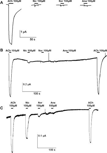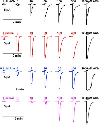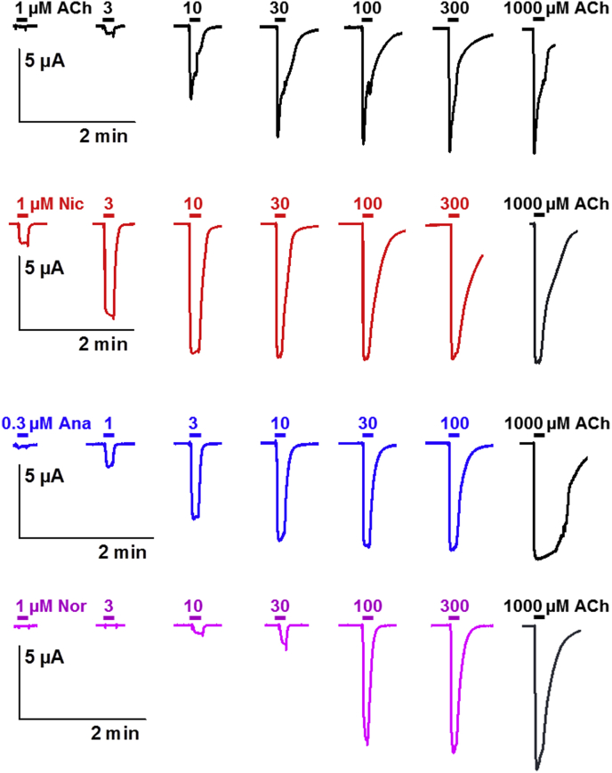 Fig. 6. Concentration-response relationships of acetylcholine and nicotine derivatives on the P. equorum N-AChR expressed in Xenopus oocytes. Representative current traces for single oocytes perfused with acetylcholine (ACh), nicotine (Nic), anabasine (Ana) and nornicotine (Nor). The concentration of agonist (μM) is indicated above each trace.