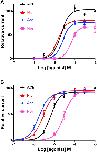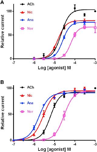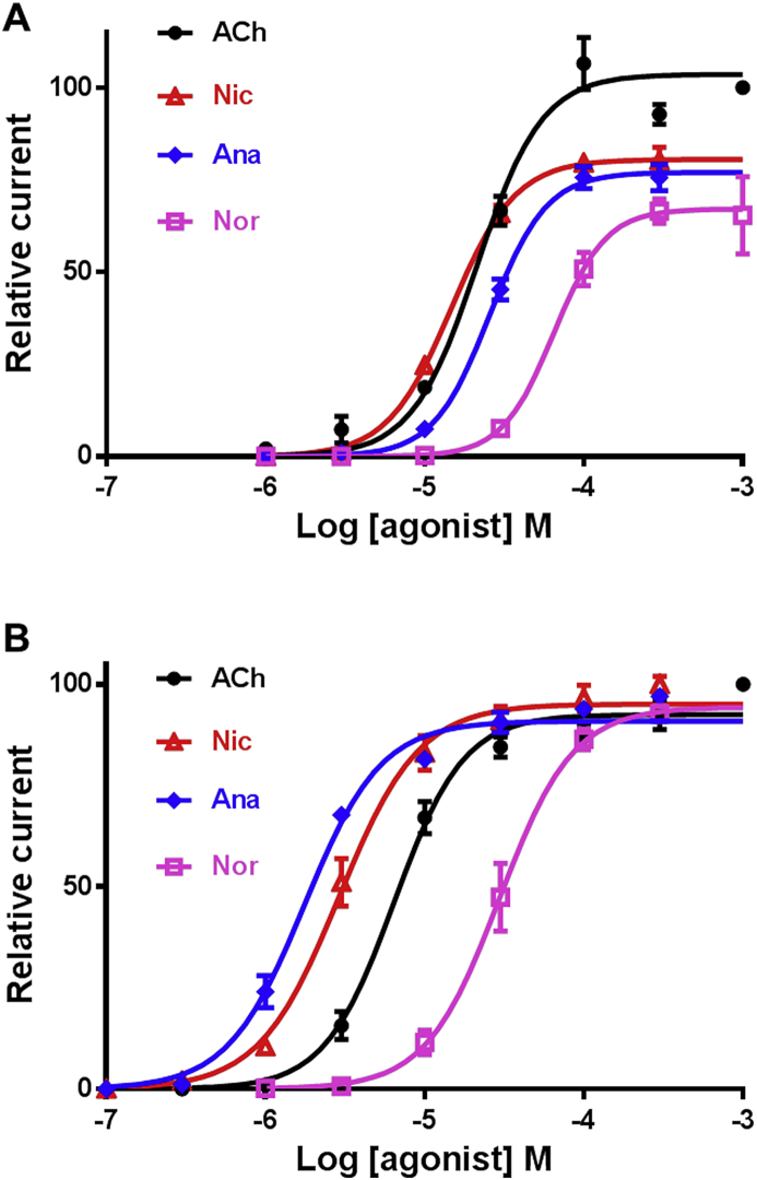 Fig. 7. Concentration-response curves of acetylcholine and nicotine derivatives on the C. elegans (A) and P. equorum (B) N-AChRs expressed in Xenopus oocytes. The N-AChRs were challenged with acetylcholine (ACh), nicotine (Nic), anabasine (Ana) and nornicotine (Nor). All responses are normalized to 1 mM Ach. Results are shown as the mean ± se.
