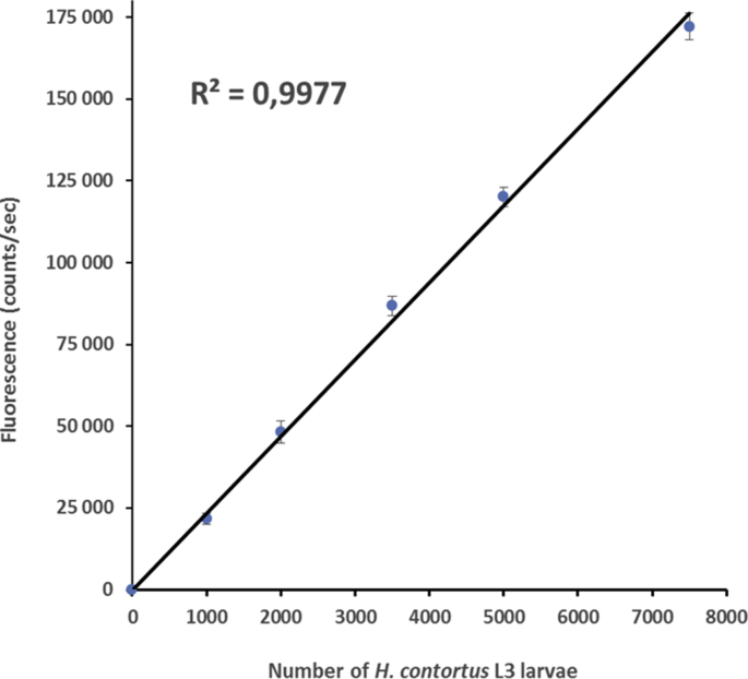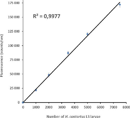 S1Fig. tif. H. contortus L3 larvae migration assay using auto-fluorescence quantification. Correlation between the fluorescence counting (counts/sec) and the number of L3 larvae that migrated to the recording chamber during 5min. Migration assays were performed using 1000, 2000, 3500, 5000 and 7500 L3 larvae respectively. Each data point represents mean ± SE of three independent runs