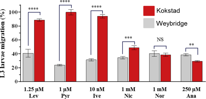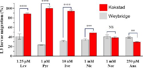 S2Fig. tif. Comparison of the motility reduction of H. contortus L3 from the Weybridge vs Kokstad isolates exposed to Levamisole (Lev), Pyrantel (Pyr), Ivermectin (Ivm), Nicotine (Nic), Nornicotine (Nor), Anabasine (Ana) as determined by ALMA assays. Mean data of the twenty last fluorescence measures ± SEM. Welsh two sample t-test, Wey vs Kok. ****p < 0.001, ***p < 0.001, **p < 0.01