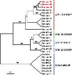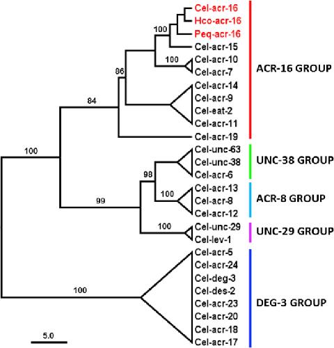 S3Fig. tif. 1. Maximum likelihood tree showing relationships of ACR-16 acetylcholine receptor (AChR) subunits from C.elegans, H. contortus and P. equorum with other C. elegans AChR subunits. Tree was built upon an alignment of AChR subunit sequences excluding the predicted signal peptide and the variable region between TM3 and TM4. The tree was rooted with DEG-3 group subunit sequences. Scale bar represents the number of substitution per site. Boostrap values > 80% are indicated on branches. Accession numbers for sequences used in the phylogenetic analysis are provided in Material and Methods section. C. elegans AChR subunit groups are named as proposed by Mongan et al. (Mongan et al., 2002). Cel, Hco and Peq refer to Caenorhabitis elegans, Haemonchus contortus and Parascaris equorum respectively
