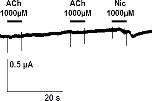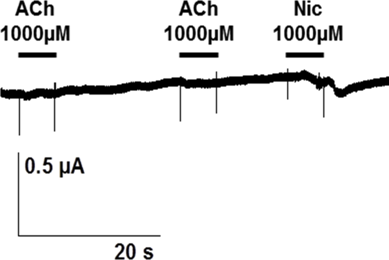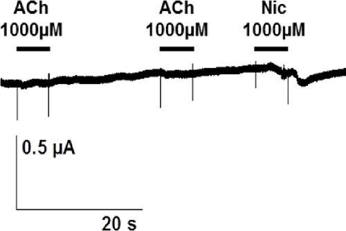 S4Fig. tif. Tentative expression of Hco-ACR-16 subunit in Xenopus oocytes. Representative recording traces from a single oocyte challenged with 1 mM ACh and 1 mM Nic. Experiment repeated in three independent batches of oocytes.