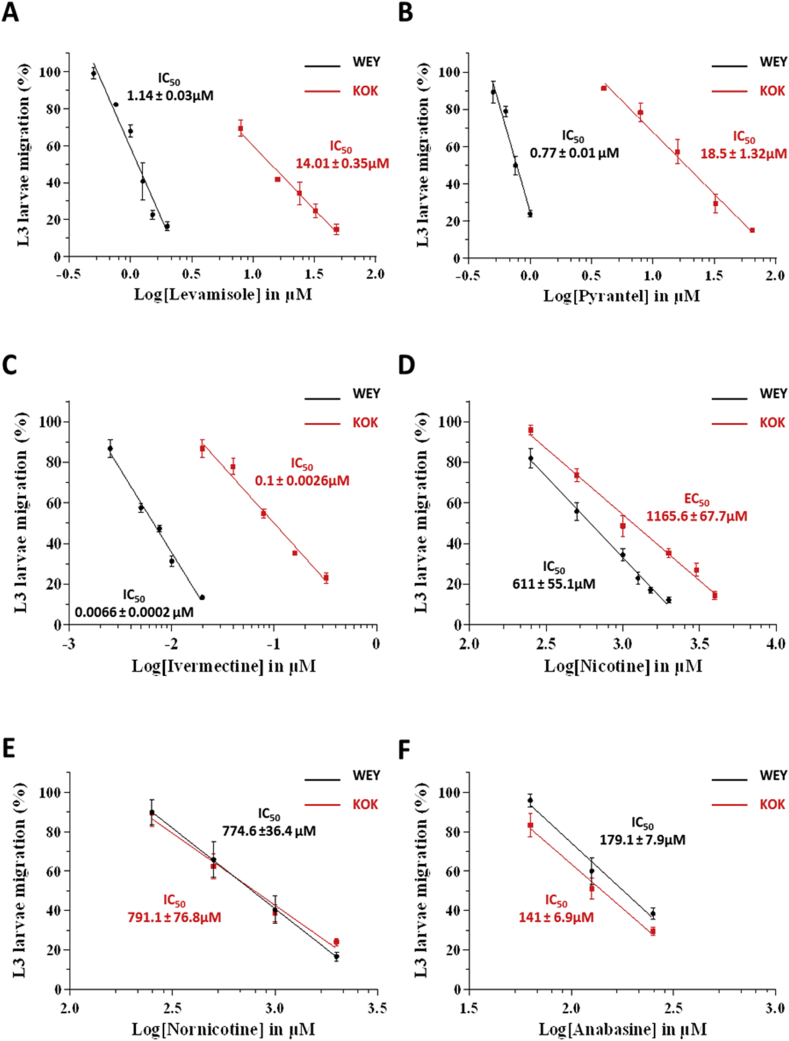 Fig. 3. Determination of the dose response relationships for levamisole (A); pyrantel (B); ivermectin (C); nicotine (D); nornicotine (E) and anabasine (F) on H. contortus L3 larvae using the automated larval migration assay (ALMA). Results are shown as the mean ± se from 3 distinct ALMA assays performed with 7500 H. contortus L3 larvae from the Weybridge isolate (in black) or Kokstad isolate (in red). IC50 values are indicated on the graphs. (For interpretation of the references to colour in this figure legend, the reader is referred to the Web version of this article.)