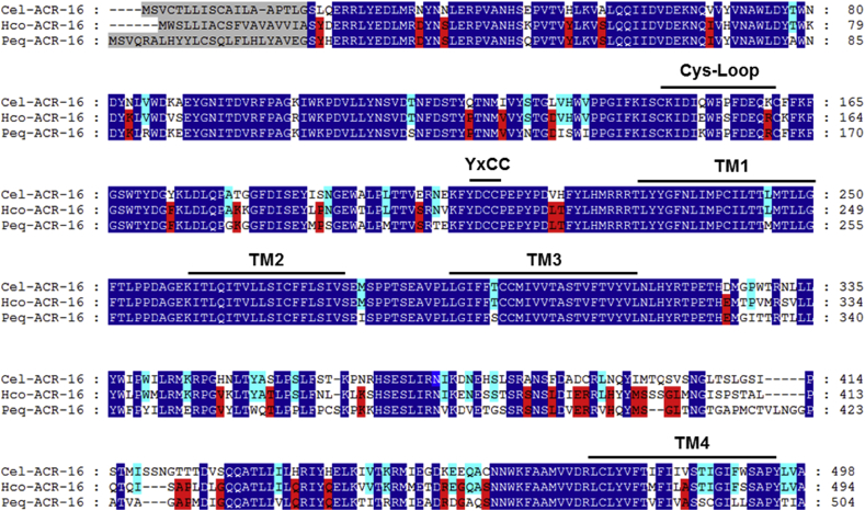 Fig. 5. Amino-acid alignments of ACR-16 subunit sequences from Caenorhabditis elegans, Haemonchus contortus and Parascaris equorum. acr-16 deduced amino-acid sequences were aligned using the MUSCLE algorithm (Edgar, 2004) and further processed using GeneDoc. Predicted signal peptide sequences are shaded in grey. Amino acids conserved between all the ACR-16 sequences are highlighted in dark blue. Amino acids specifically shared by ACR-16 homologs from parasitic species are highlighted in red. Amino acids specifically shared by Clade V nematode species (C. elegans and H. contortus) are highlighted in light blue. The cys-loop, the four transmembrane regions (TM1–TM4) and the primary agonist binding (YxCC) are indicated above the sequences. Cel (Caenorhabditis elegans), Hco (Haemonchus contortus), Peq (Parascaris equorum). (For interpretation of the references to colour in this figure legend, the reader is referred to the Web version of this article.)
