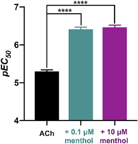 Fig. 4. Effects of menthol as a PAM on levamisole sensitive O. dentatum nAChR acetylcholine responses. A. Sample traces for two-electrode voltage-clamp recording showing inward currents in response to ascending concentrations of acetylcholine alone, acetylcholine in the presence of 0.1 μM and 10 μM menthol. B. Concentration-response relationships for acetylcholine alone (n = 7, black), acetylcholine in the presence of 0.1 μM (n = 6, blue) and 10 μM menthol (n = 7, purple). pEC50 (mean ± SEM), EC50 (mean, μM), Hill slope (nH) (mean ± SEM) and Imax (mean ± SEM%) values were respectively: 5.3 ± 0.0, 5.0 μM, 1.4 ± 0.1 and 107.5 ± 2.6 for acetylcholine alone; 6.4 ± 0.1, 0.4 μM, 1.0 ± 0.1 and 109.0 ± 3.6 in the presence of 0.1 μM menthol; 6.5 ± 0.1, 0.3 μM, 1.0 ± 0.1 and 110.5 ± 3.7 in the presence of 10 μM menthol. Bottom was constrained to zero for curve fitting. C. Bar chart showing comparison of pEC50 (expressed as mean ± SEM) for acetylcholine in the presence and absence of menthol. ****P < 0.0001; significantly different as indicated; extra sum of squares F-test. (For interpretation of the references to colour in this figure legend, the reader is referred to the Web version of this article.)