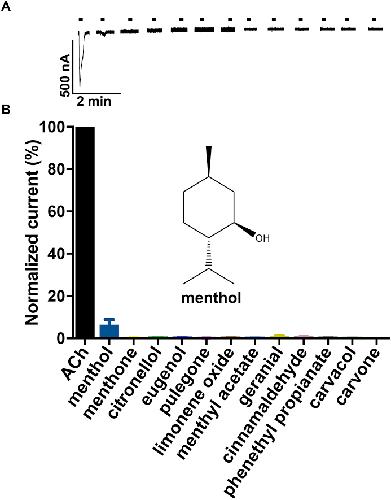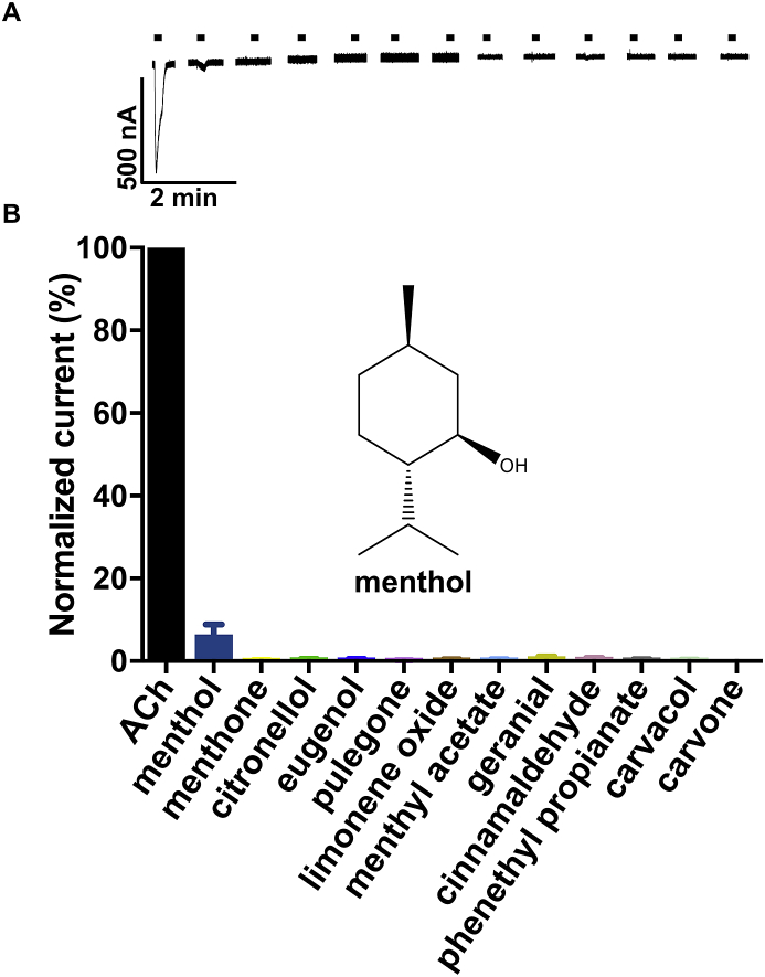 Fig. 2. Agonist effects of monoterpenoid compounds on levamisole sensitive O. dentatum nAChR. A. Sample traces for the agonist experiment. B. Bar chart (expressed as mean ± SEM%) showing agonistic effects of the monoterpenoid compounds: menthol (6.5 ± 2.4%, n = 6), geraniol (0.9 ± 0.2%, n = 6), cinnamaldehyde (0.6 ± 0.2%, n = 6), citronellol (0.4 ± 0.2%, n = 6), menthyl acetate (0.3 ± 0.1%, n = 6), eugenol (0.3 ± 0.2%, n = 6), phenethyl propionate (0.3 ± 0.1%, n = 6), limonene oxide (0.3 ± 0.2%, n = 6), carvacrol (0.2 ± 0.2%, n = 6), menthone (0.2 ± 0.1%, n = 6), pulegone (0.1 ± 0.1%, n = 6) and carvone (0.0 ± 0.0%, n = 6).