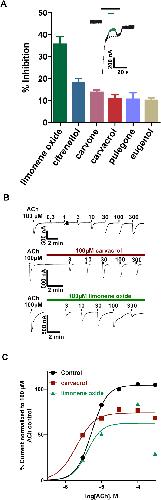Fig. 3. Effect of monoterpenoid compounds as antagonists on levamisole sensitive O. dentatum receptor acetylcholine mediated responses. A. Bar graph showing the rank order potency of monoterpenoid compounds as antagonists. Results were expressed as % mean inhibition ± SEM of currents elicited by 100 μM ACh: limonene oxide (36.0 ± 3.2%, n = 6) > citronellol (18.0 ± 1.6%, n = 6) > carvone (14.0 ± 0.6%, n = 6) > carvacrol (11.0 ± 1.6%, n = 6) = pulegone (11.0 ± 2.6%, n = 6) = eugenol (11.0 ± 1.0%, n = 6). Inset: image showing predicted acetylcholine response in the absence of limonene oxide (dotted line) and inhibition of acetylcholine mediated response in the presence of limonene oxide (highlighted in green). B. Acetylcholine current responses, recorded from the Xenopus oocyte expressing the levamisole sensitive channel, alone and in the presence of 100 μM carvacrol (n = 6) & 100 μM limonene oxide (n = 5). C. Concentration-response plots for acetylcholine alone (n = 6, black) and acetylcholine in the presence of 100 μM carvacrol (n = 6, maroon) & 100 μM limonene oxide (n = 5, green). pEC50 (mean ± SEM), EC50 (mean, μM), Hill slope (nH) (mean ± SEM) and Imax (mean ± SEM%) values were respectively: 5.3 ± 0.0, 5.3 μM, 2.0 ± 0.2 and 104.6 ± 1.6 for acetylcholine alone; 5.4 ± 0.2, 4.0 μM, 2.2 ± 1.7 and 62.8 ± 7.0 in the presence of limonene oxide; 5.7 ± 0.1, 2.0 μM, 1.7 ± 1.1 and 74.1 ± 3.2 in the presence of carvacrol. Bottom was constrained to zero for curve fitting. (For interpretation of the references to colour in this figure legend, the reader is referred to the Web version of this article.)
