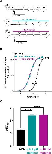 Fig. 4. Effects of menthol as a PAM on levamisole sensitive O. dentatum nAChR acetylcholine responses. A. Sample traces for two-electrode voltage-clamp recording showing inward currents in response to ascending concentrations of acetylcholine alone, acetylcholine in the presence of 0.1 μM and 10 μM menthol. B. Concentration-response relationships for acetylcholine alone (n = 7, black), acetylcholine in the presence of 0.1 μM (n = 6, blue) and 10 μM menthol (n = 7, purple). pEC50 (mean ± SEM), EC50 (mean, μM), Hill slope (nH) (mean ± SEM) and Imax (mean ± SEM%) values were respectively: 5.3 ± 0.0, 5.0 μM, 1.4 ± 0.1 and 107.5 ± 2.6 for acetylcholine alone; 6.4 ± 0.1, 0.4 μM, 1.0 ± 0.1 and 109.0 ± 3.6 in the presence of 0.1 μM menthol; 6.5 ± 0.1, 0.3 μM, 1.0 ± 0.1 and 110.5 ± 3.7 in the presence of 10 μM menthol. Bottom was constrained to zero for curve fitting. C. Bar chart showing comparison of pEC50 (expressed as mean ± SEM) for acetylcholine in the presence and absence of menthol. ****P < 0.0001; significantly different as indicated; extra sum of squares F-test. (For interpretation of the references to colour in this figure legend, the reader is referred to the Web version of this article.)