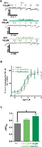 Fig. 4. Effects of menthol as a PAM on levamisole sensitive O. dentatum nAChR acetylcholine responses. A. Sample traces for two-electrode voltage-clamp recording showing inward currents in response to ascending concentrations of acetylcholine alone, acetylcholine in the presence of 0.1 μM and 10 μM menthol. B. Concentration-response relationships for acetylcholine alone (n = 7, black), acetylcholine in the presence of 0.1 μM (n = 6, blue) and 10 μM menthol (n = 7, purple). pEC50 (mean ± SEM), EC50 (mean, μM), Hill slope (nH) (mean ± SEM) and Imax (mean ± SEM%) values were respectively: 5.3 ± 0.0, 5.0 μM, 1.4 ± 0.1 and 107.5 ± 2.6 for acetylcholine alone; 6.4 ± 0.1, 0.4 μM, 1.0 ± 0.1 and 109.0 ± 3.6 in the presence of 0.1 μM menthol; 6.5 ± 0.1, 0.3 μM, 1.0 ± 0.1 and 110.5 ± 3.7 in the presence of 10 μM menthol. Bottom was constrained to zero for curve fitting. C. Bar chart showing comparison of pEC50 (expressed as mean ± SEM) for acetylcholine in the presence and absence of menthol. ****P < 0.0001; significantly different as indicated; extra sum of squares F-test. (For interpretation of the references to colour in this figure legend, the reader is referred to the Web version of this article.)