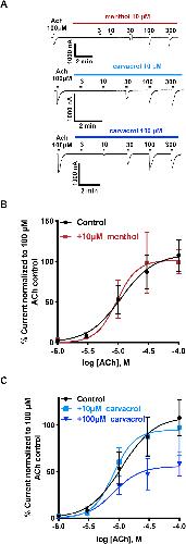 Fig. 6. Effects of menthol and carvacrol on nicotine sensitive A. suum ACR-16 nAChR acetylcholine responses. A. Representative current traces for two-electrode voltage-clamp recording showing inward currents in response to increasing acetylcholine concentrations in the presence of menthol (10 μM) and carvacrol (10 μM and 100 μM) B. Concentration-response plot for acetylcholine alone (n = 7, black) and acetylcholine in the presence of menthol (n = 6, red). pEC50 (mean ± SEM) and EC50 (mean, μM) values were respectively: 5.0 ± 0.1 and 11.1 μM for acetylcholine alone, 5.0 ± 0.1 and 9.5 μM in the presence of 10 μM menthol. Hill slope (nH) (mean ± SEM) values were: 1.6 ± 0.3 for acetylcholine alone; 2.5 ± 1.2 in the presence of 10 μM menthol. Imax (mean ± SEM%) values were: 109.1 ± 6.6 for acetylcholine alone; 101.6 ± 7.5 in the presence of 10 μM menthol. Bottom was constrained to zero for curve fitting. C. Concentration-response plots for acetylcholine alone (n = 7, black) and in the presence of carvacrol (n = 6, blue). pEC50 (mean ± SEM), EC50 (mean, μM), Hill slope (nH) (mean ± SEM) and Imax (mean ± SEM%) values were respectively: 5.1 ± 0.1, 8.1 μM, 2.5 ± 0.8 and 94.6 ± 5.9 in the presence of 10 μM carvacrol; 5.1 ± 0.1, 8.2 μM, 2.0 ± 0.7 and 55.8 ± 4.4 in the presence of 100 μM carvacrol. Bottom was constrained to zero for curve fitting. (For interpretation of the references to colour in this figure legend, the reader is referred to the Web version of this article.)