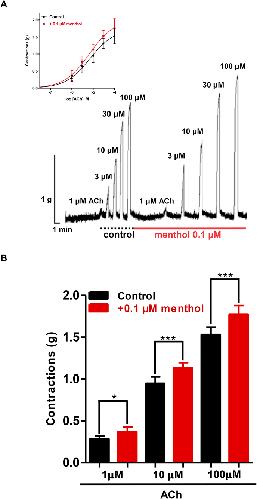 Fig. 7. A. Sample trace for the A. suum muscle flap contraction experiments. Inset: concentration-response plots for acetylcholine alone (n = 6, black) and in the presence of 0.1 μM menthol (n = 6, red). pEC50 (mean ± SEM) and EC50 (mean, μM) values were respectively: 5.2 ± 0.2 and 7.0 μM for acetylcholine alone; 5.2 ± 0.2 and 6.5 μM in the presence of 0.1 μM menthol. Rmax (mean ± SEM, g) values were: 1.7 ± 0.2 g for acetylcholine alone and 2.0 ± 0.2 g in the presence of 0.1 μM menthol. Hill slope (nH) (mean ± SEM) values were: 0.8 ± 0.2 for acetylcholine alone and 0.8 ± 0.1 in the presence of 0.1 μM menthol. Bottom was constrained to zero for curve fitting. B. Bar chart summarizing the results showing significant potentiation in amplitude of acetylcholine mediated contractions in the presence of 0.1 μM menthol. *P < 0.05, ***P < 0.001; significantly different as indicated; paired t-tests. (For interpretation of the references to colour in this figure legend, the reader is referred to the Web version of this article.)