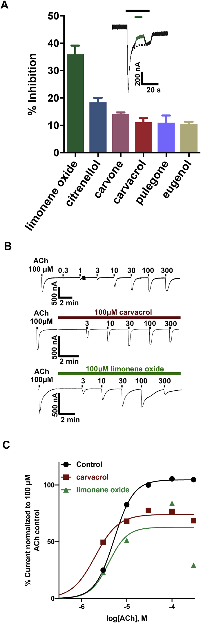 Fig. 3. Effect of monoterpenoid compounds as antagonists on levamisole sensitive O. dentatum receptor acetylcholine mediated responses. A. Bar graph showing the rank order potency of monoterpenoid compounds as antagonists. Results were expressed as % mean inhibition ± SEM of currents elicited by 100 μM ACh: limonene oxide (36.0 ± 3.2%, n = 6) > citronellol (18.0 ± 1.6%, n = 6) > carvone (14.0 ± 0.6%, n = 6) > carvacrol (11.0 ± 1.6%, n = 6) = pulegone (11.0 ± 2.6%, n = 6) = eugenol (11.0 ± 1.0%, n = 6). Inset: image showing predicted acetylcholine response in the absence of limonene oxide (dotted line) and inhibition of acetylcholine mediated response in the presence of limonene oxide (highlighted in green). B. Acetylcholine current responses, recorded from the Xenopus oocyte expressing the levamisole sensitive channel, alone and in the presence of 100 μM carvacrol (n = 6) & 100 μM limonene oxide (n = 5). C. Concentration-response plots for acetylcholine alone (n = 6, black) and acetylcholine in the presence of 100 μM carvacrol (n = 6, maroon) & 100 μM limonene oxide (n = 5, green). pEC50 (mean ± SEM), EC50 (mean, μM), Hill slope (nH) (mean ± SEM) and Imax (mean ± SEM%) values were respectively: 5.3 ± 0.0, 5.3 μM, 2.0 ± 0.2 and 104.6 ± 1.6 for acetylcholine alone; 5.4 ± 0.2, 4.0 μM, 2.2 ± 1.7 and 62.8 ± 7.0 in the presence of limonene oxide; 5.7 ± 0.1, 2.0 μM, 1.7 ± 1.1 and 74.1 ± 3.2 in the presence of carvacrol. Bottom was constrained to zero for curve fitting. (For interpretation of the references to colour in this figure legend, the reader is referred to the Web version of this article.)