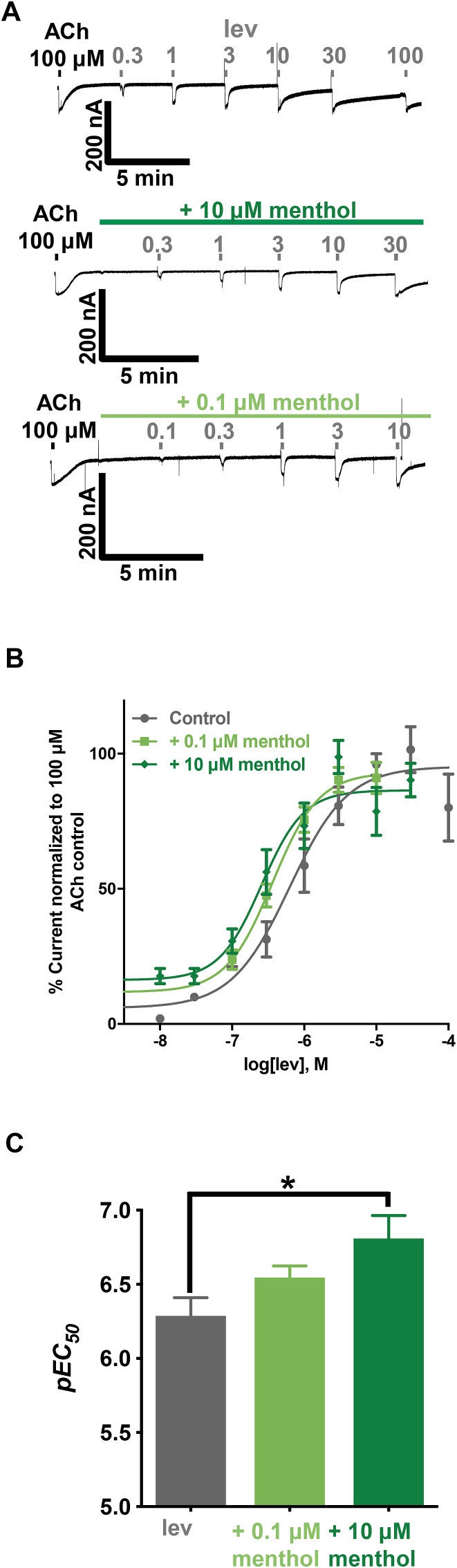 Fig. 5. Effects of menthol on levamisole sensitive nAChR levamisole responses. A. Representative current traces for two-electrode voltage-clamp recording showing inward currents in response to ascending application of levamisole alone, levamisole in the presence of 0.1 μM and 10 μM menthol. B. Concentration-response relationships for levamisole alone (n = 7, steel gray) and in the presence of 0.1 μM (n = 6, light green) and 10 μM menthol (n = 7, dark green). pEC50 (mean ± SEM), EC50 (mean, μM), Hill slope (nH) (mean ± SEM) and Imax (mean ± SEM%) values were respectively: 6.3 ± 0.1, 0.5 μM, 1.0 ± 0.2 and 96.3 ± 5.2 for levamisole alone; 6.5 ± 0.1, 0.3 μM, 1.1 ± 0.2 and 94.6 ± 5.0 in the presence of 0.1 μM menthol; 6.8 ± 0.2, 0.2 μM, 1.0 ± 0.2 and 89.2 ± 6.0 in the presence of 10 μM menthol. Bottom was constrained to zero for curve fitting. C. Bar chart summarizing the results showing comparison of pEC50 (expressed as mean ± SEM) for levamisole in the presence and absence of menthol. *P < 0.05; significantly different as indicated; extra sum of squares F-test. (For interpretation of the references to colour in this figure legend, the reader is referred to the Web version of this article.)