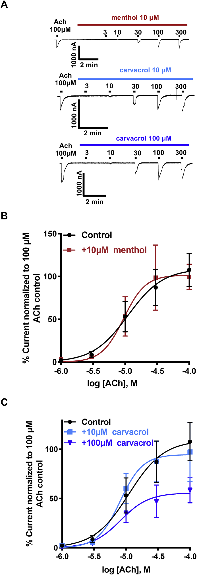 Fig. 6. Effects of menthol and carvacrol on nicotine sensitive A. suum ACR-16 nAChR acetylcholine responses. A. Representative current traces for two-electrode voltage-clamp recording showing inward currents in response to increasing acetylcholine concentrations in the presence of menthol (10 μM) and carvacrol (10 μM and 100 μM) B. Concentration-response plot for acetylcholine alone (n = 7, black) and acetylcholine in the presence of menthol (n = 6, red). pEC50 (mean ± SEM) and EC50 (mean, μM) values were respectively: 5.0 ± 0.1 and 11.1 μM for acetylcholine alone, 5.0 ± 0.1 and 9.5 μM in the presence of 10 μM menthol. Hill slope (nH) (mean ± SEM) values were: 1.6 ± 0.3 for acetylcholine alone; 2.5 ± 1.2 in the presence of 10 μM menthol. Imax (mean ± SEM%) values were: 109.1 ± 6.6 for acetylcholine alone; 101.6 ± 7.5 in the presence of 10 μM menthol. Bottom was constrained to zero for curve fitting. C. Concentration-response plots for acetylcholine alone (n = 7, black) and in the presence of carvacrol (n = 6, blue). pEC50 (mean ± SEM), EC50 (mean, μM), Hill slope (nH) (mean ± SEM) and Imax (mean ± SEM%) values were respectively: 5.1 ± 0.1, 8.1 μM, 2.5 ± 0.8 and 94.6 ± 5.9 in the presence of 10 μM carvacrol; 5.1 ± 0.1, 8.2 μM, 2.0 ± 0.7 and 55.8 ± 4.4 in the presence of 100 μM carvacrol. Bottom was constrained to zero for curve fitting. (For interpretation of the references to colour in this figure legend, the reader is referred to the Web version of this article.)
