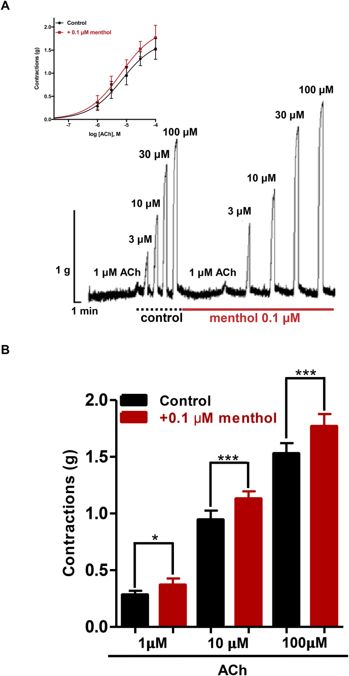Fig. 7. A. Sample trace for the A. suum muscle flap contraction experiments. Inset: concentration-response plots for acetylcholine alone (n = 6, black) and in the presence of 0.1 μM menthol (n = 6, red). pEC50 (mean ± SEM) and EC50 (mean, μM) values were respectively: 5.2 ± 0.2 and 7.0 μM for acetylcholine alone; 5.2 ± 0.2 and 6.5 μM in the presence of 0.1 μM menthol. Rmax (mean ± SEM, g) values were: 1.7 ± 0.2 g for acetylcholine alone and 2.0 ± 0.2 g in the presence of 0.1 μM menthol. Hill slope (nH) (mean ± SEM) values were: 0.8 ± 0.2 for acetylcholine alone and 0.8 ± 0.1 in the presence of 0.1 μM menthol. Bottom was constrained to zero for curve fitting. B. Bar chart summarizing the results showing significant potentiation in amplitude of acetylcholine mediated contractions in the presence of 0.1 μM menthol. *P < 0.05, ***P < 0.001; significantly different as indicated; paired t-tests. (For interpretation of the references to colour in this figure legend, the reader is referred to the Web version of this article.)