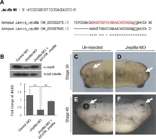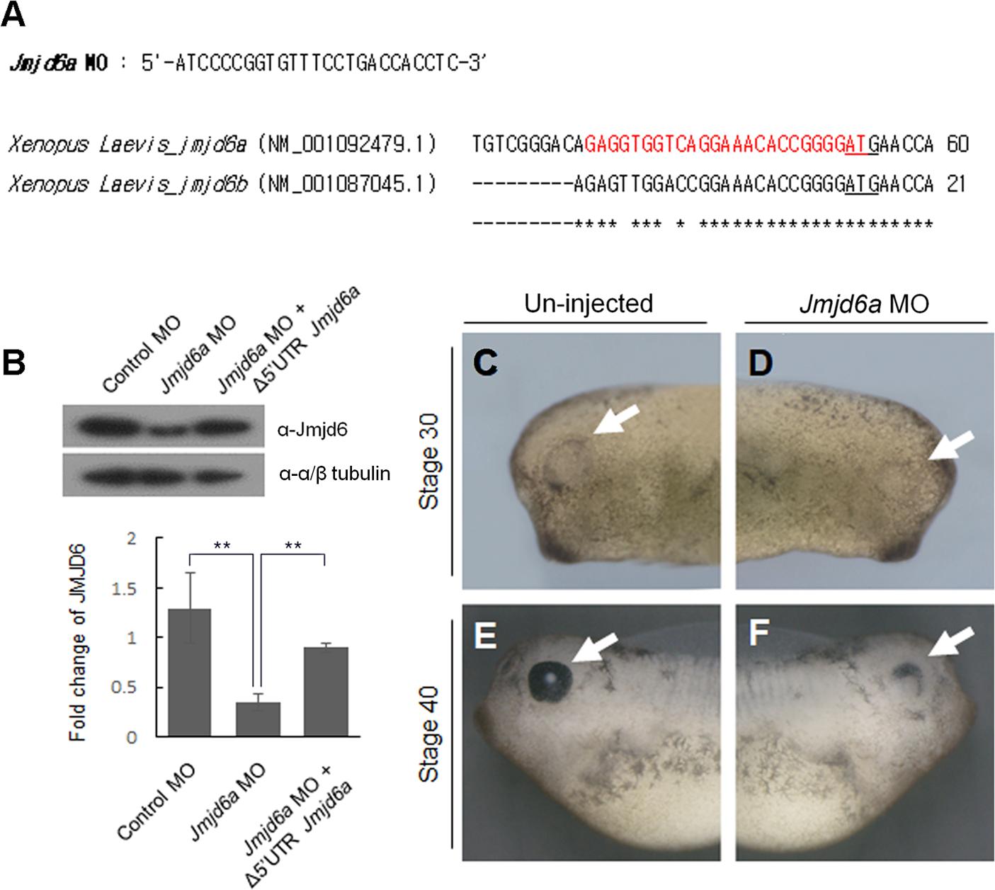 (A) Antisense morpholino oligonucleotide against Jmjd6 (Jmjd6 MO) was designed to cover 5’ UTR and the translation start site of Xenopus Jmjd6 gene (red). Underline denotes translation start codon. Asterisk denotes conserved nucleotide between Xenopus Jmjd6a and Jmjd6b. (B) Knockdown efficiency of Jmjd6 MO was evaluated by western blot analysis (n = 3). To test the specificity of Jmjd6a MO, Jmjd6a mRNA without 5’UTR (Δ5’UTR Jmjd6a) was co-injected. Control or Jmjd6 MO was injected into one blastomere at the 8-cell stage. Lysates from Xenopus embryos (stage 26) were immunoblotted with anti-Jmjd6 or anti-tubulin antibodies. Western blots were analyzed quantitatively. Data represent mean ± SD. Significance value is **P ≤ 0.01. (C~F) Compared with the un-injected side of embryos, smaller eye at stage 30 (white arrow) and partially developed eye (white arrow) were observed in Jmjd6 MO-injected sides (n = 3). Lateral views are shown.