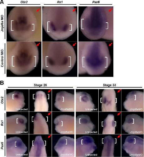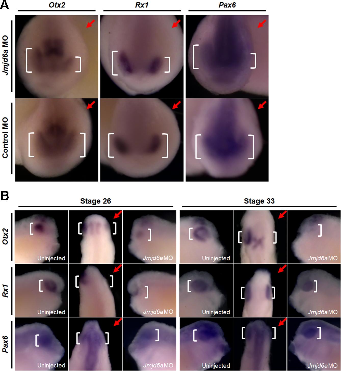 Expression of genes related to Xenopus eye development was analyzed by whole-mount in situ hybridization (n = 3). (A) At stage 22, expressions of Otx2, RX1, and Pax6 (white bracket) are decreased in the Jmjd6a MO-injected side (red arrow). However, the gene expression (white bracket) is not altered in the control MO-injected sides (red arrow) of embryos. Anterior view is shown. (B) At stages 26 and 33, the gene expression (white bracket) is also decreased in the Jmjd6a MO-injected side (red arrow). Lateral (left and right) and dorsal (middle) views are shown.