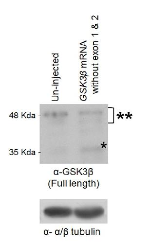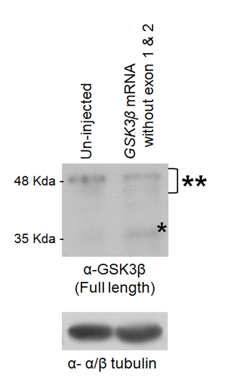Synthesized GSK3β RNA without exon1 and 2 was injected into Xenopus embryos and the lysate was analyzed by western blotting using an antibody recognizing the full length of GSK3β. An extra 35 kDa band of GSK3β is detected (*). Endogenous full length of GSK3β is denoted as **.