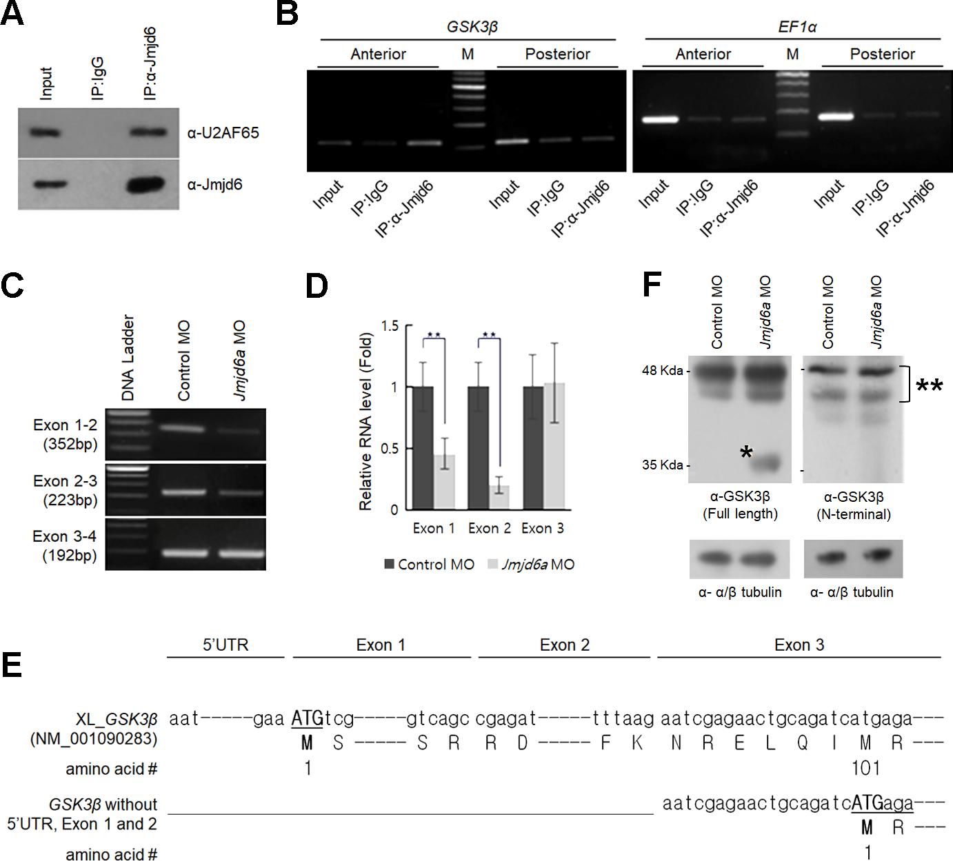 (A) Jmjd6 interacts with U2AF65. Lysate from the anterior region of embryos (stage 26) was subjected to immunoprecipitation with anti-Jmjd6 antibody, and immunoblot with anti-U2AF65 antibody (n = 3). As a negative control, IgG was used. (B) Jmjd6 interacts with Xenopus GSK3β RNA. RNA-immunoprecipitation was performed with Jmjd6 antibody using lysates from the anterior and posterior region of embryos (stage 26) (n = 3). Xenopus GSK3β and EF1α RNA were analyzed by RT-PCR. As a negative control, IgG was used. (C) Knockdown of Jmjd6a induces generation of Xenopus GSK3β RNA without exon 1 and 2. RT-PCR was performed in the control or Jmjd6a MO-injected anterior region of embryos using exon-specific oligonucleotides (n = 3). (D) Real time-PCR analysis for Xenopus GSK3β RNA splicing in the control or Jmjd6a MO-injected anterior region of embryos using exon-specific oligonucleotides (n = 3). Relative expressions were normalized with GSK3β RNA exon 10. Data represent mean ± SD. Significance values are **P ≤ 0.01. (E) 5’RACE (rapid amplification of cDNA ends) analysis indicates that GSK3β RNA starts with exon 3 in Jmjd6a MO-injected embryos. (F) Knockdown of Jmjd6a results in generation of an N’-terminal truncated form of Xenopus GSK3β protein with a molecular weight of approximately 35kDa (*). Endogenous full length of GSK3β proteins are denoted as **. Western blot analysis using lysate from the anterior region of embryos at stage 26 was performed with antibodies recognizing full-length or N-terminal of GSK3β (n = 3). Anti-tubulin antibody was used as a loading control.