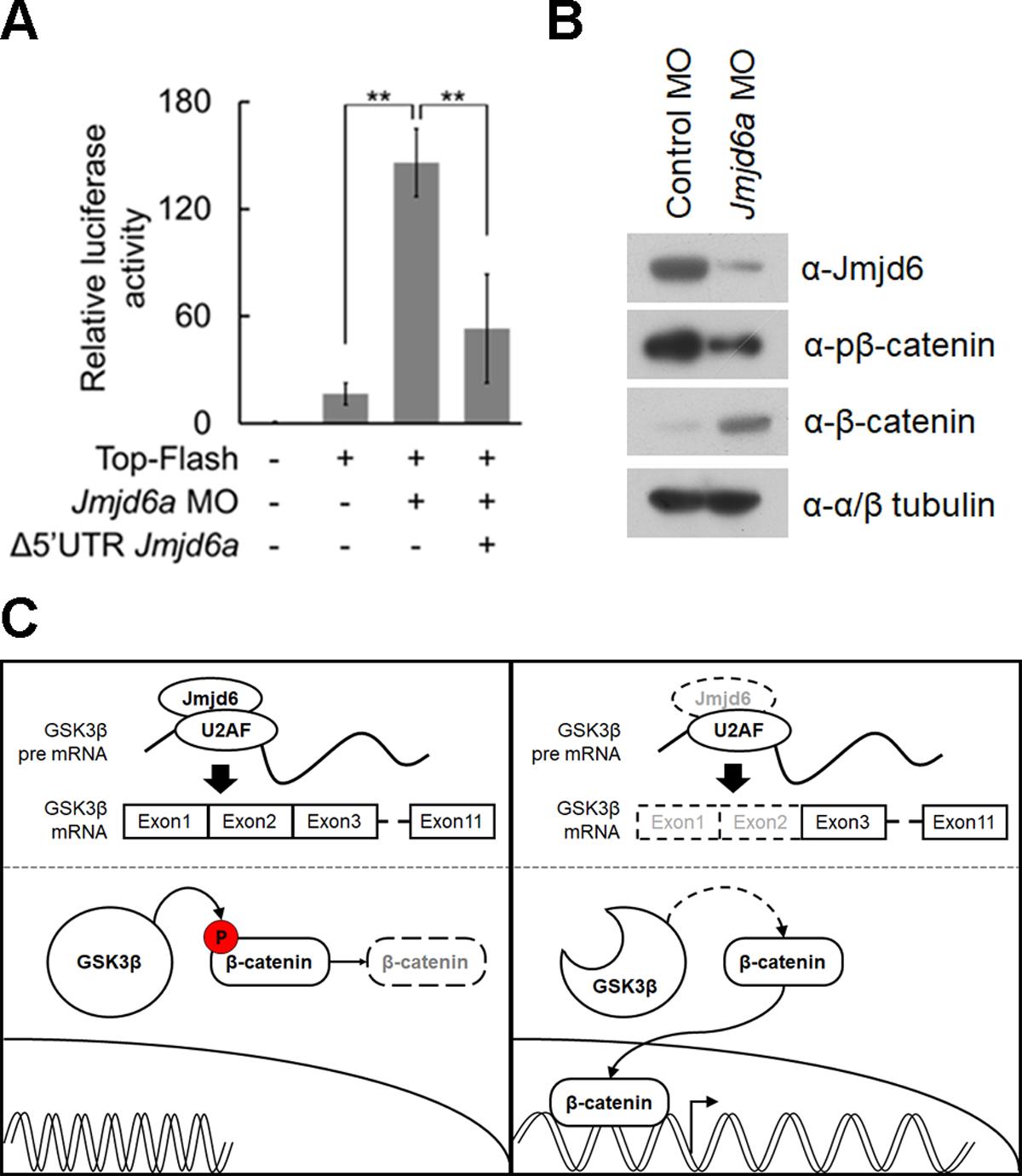 (A) Knockdown of Jmjd6a activates canonical Wnt/β-catenin signaling. TOP-Flash plasmid containing TCF binding sites was co-injected with control or Jmjd6a MO into Xenopus embryos at stage 26 (n = 3). Firefly luciferase assay was performed using lysate from the anterior region of injected embryos. Renilla luciferase activity was used to normalize firefly luciferase. Over-expression of Jmjd6a (Î5âUTR Jmjd6a) suppresses up-regulation of TOP-flash activity in Jmjd6a MO-injected embryos. Data represent mean ± SD. Significance values are **P ⤠0.01. (B) Knockdown of Jmjd6a induces decreased phosphorylation of β-catenin and increased stability of β-catenin. Lysates from the anterior region of the control or Jmjd6a MO-injected embryos (stage 26) were immunoblotted with anti-Jmjd6, anti-β-catenin, and anti-phospho β-catenin (Ser33, Ser37, Thr41) antibodies (n = 3). Anti-Tubulin antibody was used as a loading control. (C) Proposed model for Jmjd6a-mediated regulation of canonical Wnt/β-catenin signaling in Xenopus eye development.