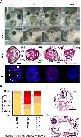 Whole-mount in situ hybridization with antisense riboprobe against Xenopus Jmjd6a and immunohistochemistry with anti-Jmjd6 antibody were performed at indicated stages (n = 3). (A) At late neurula stage (stage 20), Jmjd6a is expressed broadly in the anterior neural tissue including the eye primordia (white arrow) and brain primordia (green arrow). Posterior view is shown. (B and C) At early tailbud stage (stage 26), Jmjd6a expression is increased in the eye primordia (white arrow), brain primordia (green arrow), and neural tube (white bracket). Anterior and lateral views are shown. (C’) In transverse section of C (white dotted line), Jmjd6 protein is detected in the brain (green arrow), optic cup (white arrow), and boundary of the pharyngeal cavity (pc) at stage 26. (D) At stage 30, Jmjd6a is expressed in the forebrain (green arrow), hindbrain (red arrow) and eye (white arrow). Lateral view is shown. (D’) In transverse section of D (white dotted line), Jmjd6 protein is localized in the brain (green arrow), retinal layer (white arrow), notochord (nt), and boundary of the pharyngeal cavity (pc) at stage 30. (E) At stage 40, Jmjd6a expression is detected mainly in the forebrain (green arrow), midbrain (blue arrow), and hindbrain (red arrow). Lateral view is shown. (E’) In transverse section of E (white dotted line), Jmjd6 protein is detected in the dorsal region of brain (green arrow), optic stalk (os), and boundary of the pharynx (p) at stage 40. Nuclei were stained with DAPI. Scale bars: 50 μm.