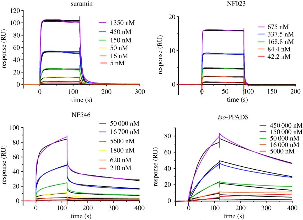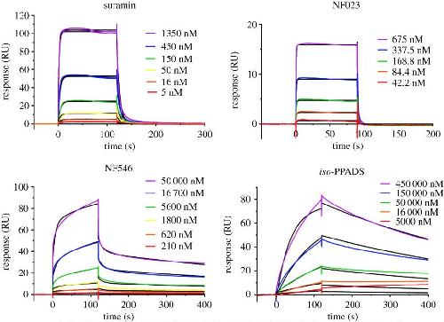 Figure 3. Binding kinetics of suramin, NF023, NF546, and iso-PPADS to immobilized hMcm10-ID. Note the rapid association and dissociation of NF023 in contrast to the slow on- and off-rates of iso-PPADS. NF546 displays slow and rapid components in both the association and dissociation phases, whereas suramin has predominantly rapid kinetics. Each figure is a representative SPR sensorgram from one of more than three experiments.