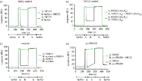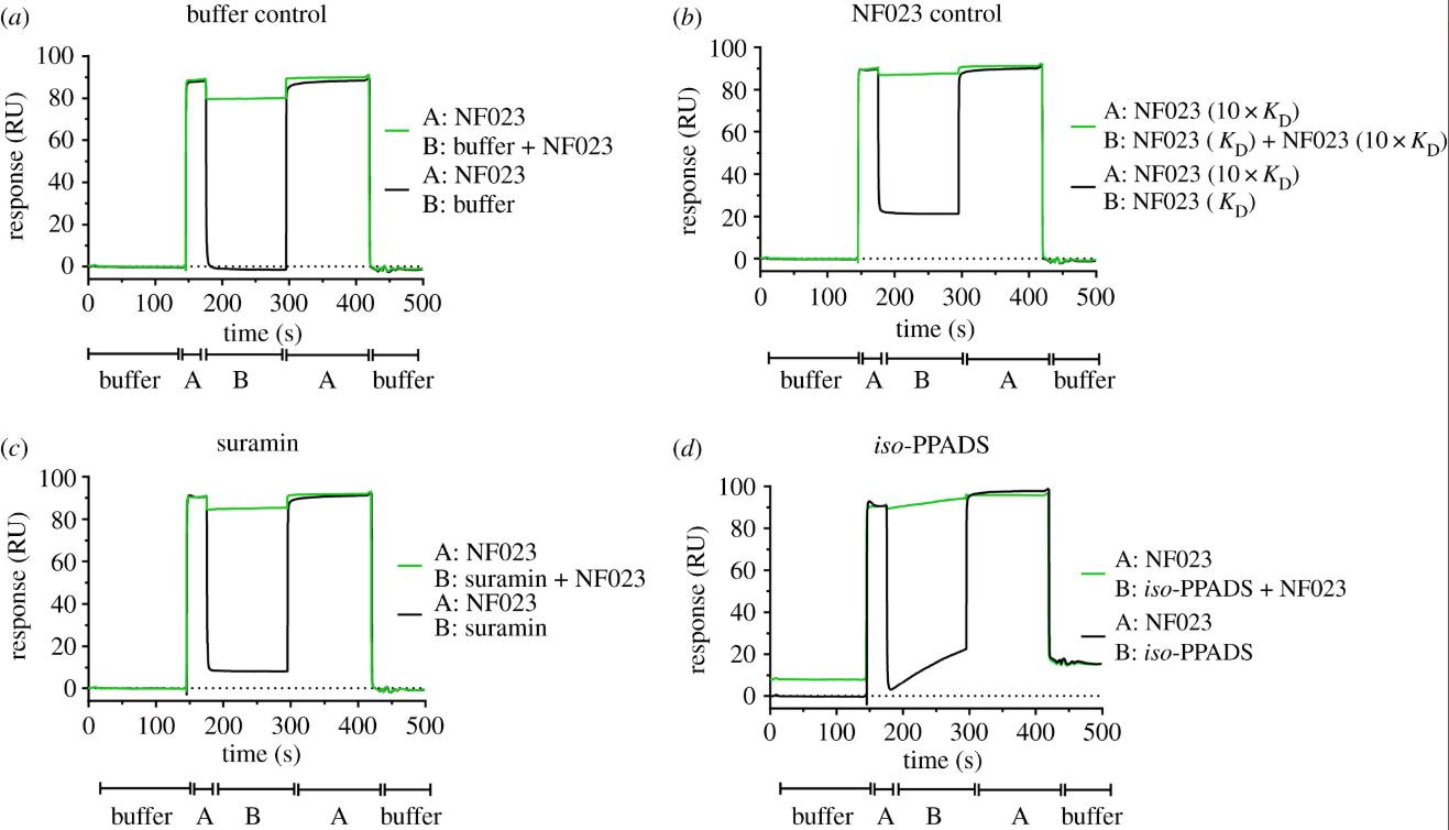 Figure 4. The slow binding inhibitor iso-PPADS competes with the fast binder NF023 for the same site on Mcm10. Representative sensorgrams of ABA SPR competition experiments (n > 3) in which injections of NF023 flank an injection of a âcompetitorâ compound: (a) running buffer, (b) NF023 self-competition, (c) suramin, or (d) iso-PPADS with and without NF023 at 10Ã KD. Note that a KD concentration of NF023, suramin, and iso-PPADS produce the expected RU in the B phase (black line), but none produce a greater response than a 10Ã KD concentration of NF023 alone (green line in B phase compared to A phases), indicating that they compete with NF023 for the same site.