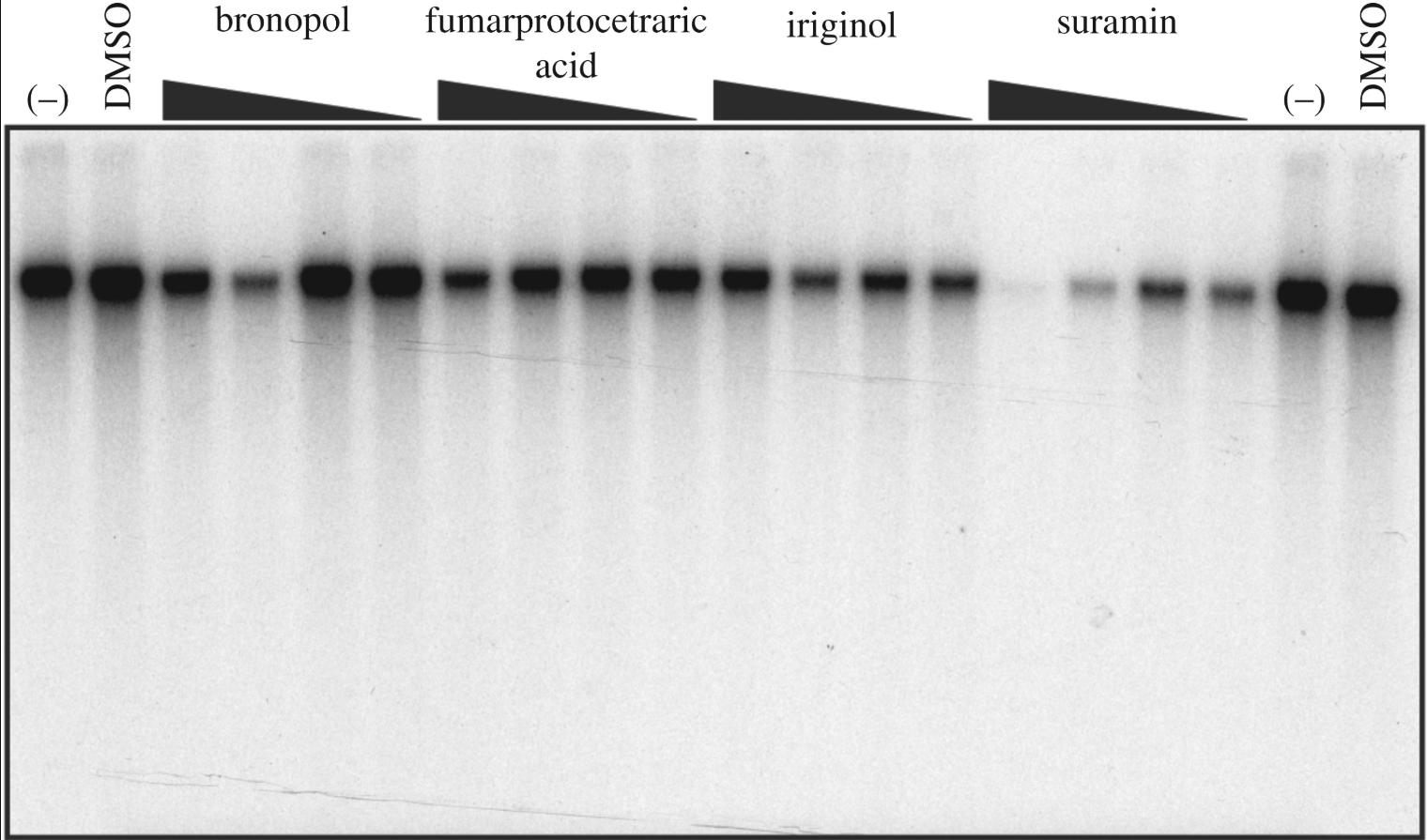 Figure 1. Suramin inhibits DNA replication in an in vitro Xenopus replication assay. HTS hits were evaluated for inhibition of [α-32P]dGTP incorporation into DNA using a cell-free extract prepared from Xenopus eggs at increasing concentrations (10, 50, 150 and 300 µM indicated by black triangle from right to left). No chemical (â) and DMSO were used as negative controls for replication inhibition (far left and far right lanes).