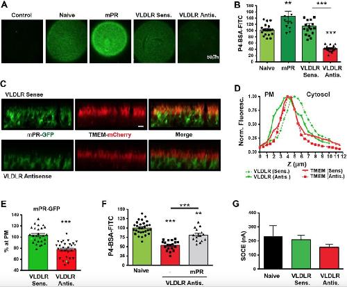 Figure 2. VLDLR is essential for mPR localization to the plasma. (A,B) Effect of VLDLR knockdown on endogenous mPR trafficking. Oocytes were left untreated (Naïve) or injected with mPR RNA or VLDLR sense or antisense oligonucleotides and stained with P4âBSAâFluorescein 48â h later to quantify the levels of endogenous mPR at the plasma membrane. (A) Low-magnification confocal images showing P4âBSAâFluorescein staining for the different treatments as indicated. The control treatment shows background staining in the absence of P4âBSAâFITC. Scale bar: 50â µm. (B) Quantification of the P4âBSAâFITC staining from ImageJ in the different treatments normalized to the average in control uninjected oocytes (Naïve). (CâE) Effect of VLDLR knockdown on trafficking of overexpressed mPR. Oocytes were co-injected with RNAs expressing mPR and the PM marker TMEMâmCherry in the presence of VLDLR sense or antisense oligonucleotides. Confocal z-stacks were acquired 48â h later with the pinhole at 1 airy unit. ImageJ was used to quantify the fluorescence in a specific ROI. (C) Representative orthogonal sections of the two individual oocytes highlighted in green in E. Scale bar: 2â µm. (D) GFP and mCherry fluorescence intensities along the z-stack section from the two individual oocytes highlighted in green in E. (E) Quantification of the percentage of overexpressed mPRâGFP localized at the PM following injection of VLDLR sense or antisense oligonucleotides. Data were normalized to the average of mPR percentage at the PM from VLDLR sense-injected oocytes. (F) VLDLR-knockdown rescue experiment. Oocytes were uninjected (Naïve) or injected with VLDLR antisense oligonucleotides with or without mPR RNA. Endogenous mPR at the PM was quantified 48â h later through P4âBSAâFITC staining. P4âBSAâFITC fluorescence in a specific ROI was quantified using ImageJ and the data normalized to the average P4âBSAâFITC fluorescence from naïve oocytes. (G) Oocytes were either uninjected (Naïve) or injected with VLDLR sense or antisense oligonucleotides as indicated, and the endogenous Ca2+-activated Cl currents, as a measure of SOCE, were recorded 48â h later as described in the Materials and Methods section. Quantitative results are mean±s.e.m. for three or more experiments or as indicated by individual data points. **P<0.01; ***P<0.001.