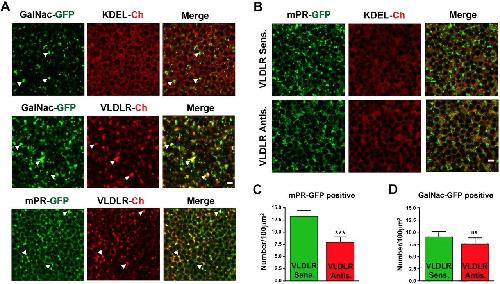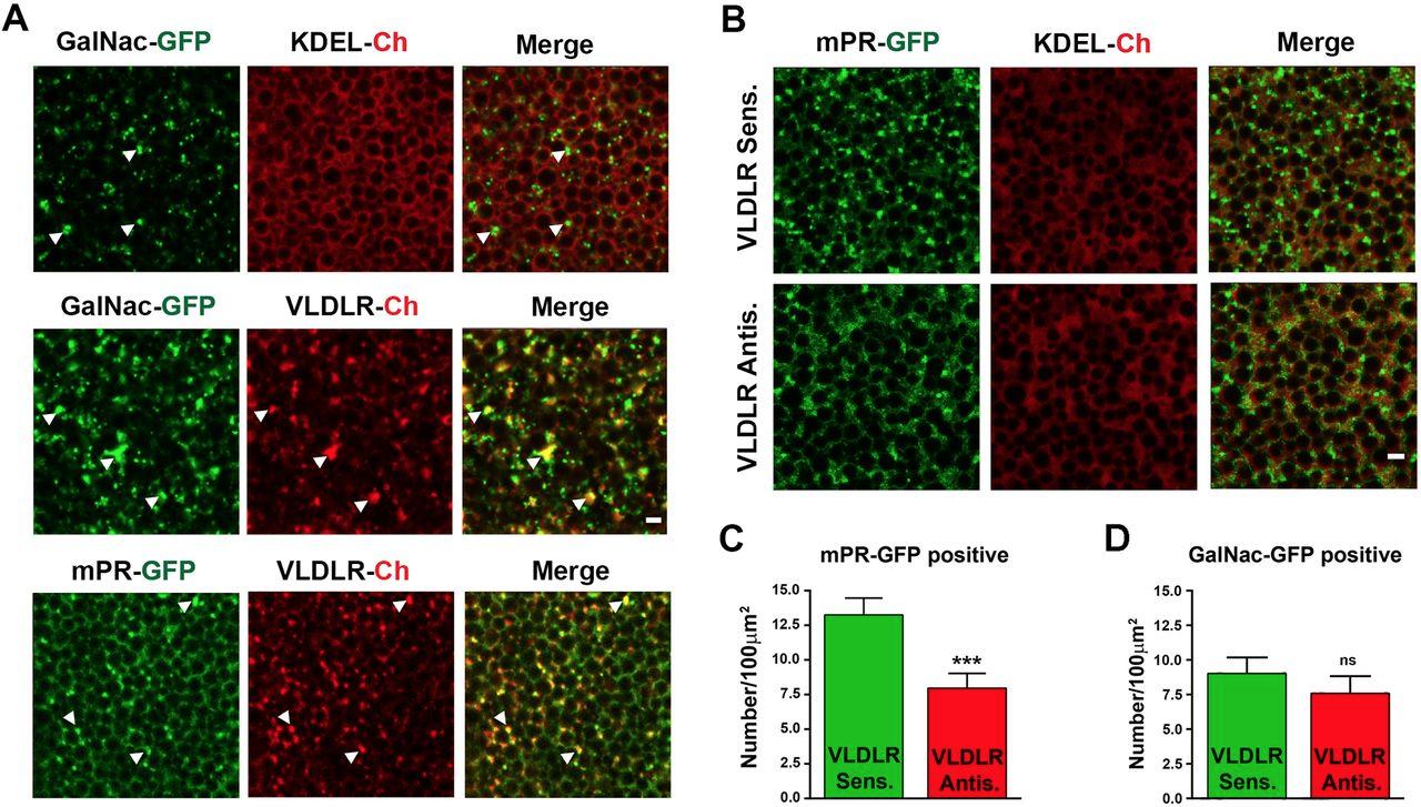 Figure 6. VLDLR is essential for mPR trafficking from the ER to the Golgi. (A) Representative intracellular focal images of individual oocytes co-injected with the Golgi marker GalNacâGFP and the ER marker KDELâmCherry, or GalNacâGFP and VLDLRâCh, or mPRâGFP and VLDLRâCh as indicated. The arrowheads point to representative Golgi puncta. (B) Effect of VLDLR knockdown on mPRâGFP trafficking from the ER to the Golgi. Oocytes were co-injected with RNAs coding for mPRâGFP and the ER marker KDELâmCherry, with VLDLR sense or antisense oligonucleotides. Confocal z-stacks were acquired 48â h later. The mPR-positive puncta represent the Golgi. Scale bars: 2 µm. (C) Quantification of the number of mPRâGFP-positive Golgi following injection of VLDLR sense or antisense oligonucleotides from images similar to the one in B. (D) Quantification of the number of Golgi (GalNac-GFP positive) in sense and antisense VLDLR-injected oocytes from images similar to those shown in A. Quantitative results are mean±s.e.m. for three or more experiments. ***P<0.001; ns, not significant.