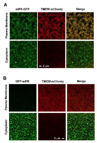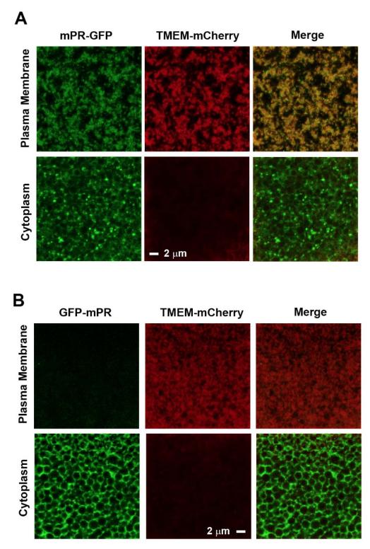 Supplemental Figure 1. Subcellular localization of N- (GFP-mPR) and C-terminally (mPRGFP)-tagged mPR. Representative focal plane images at the plasma membrane or deep within the cell of oocytes 48 hrs after injecting RNAs expressing the PM marker TMEM-mCherry along with mPR-GFP (A) or GFP-mPR (B).