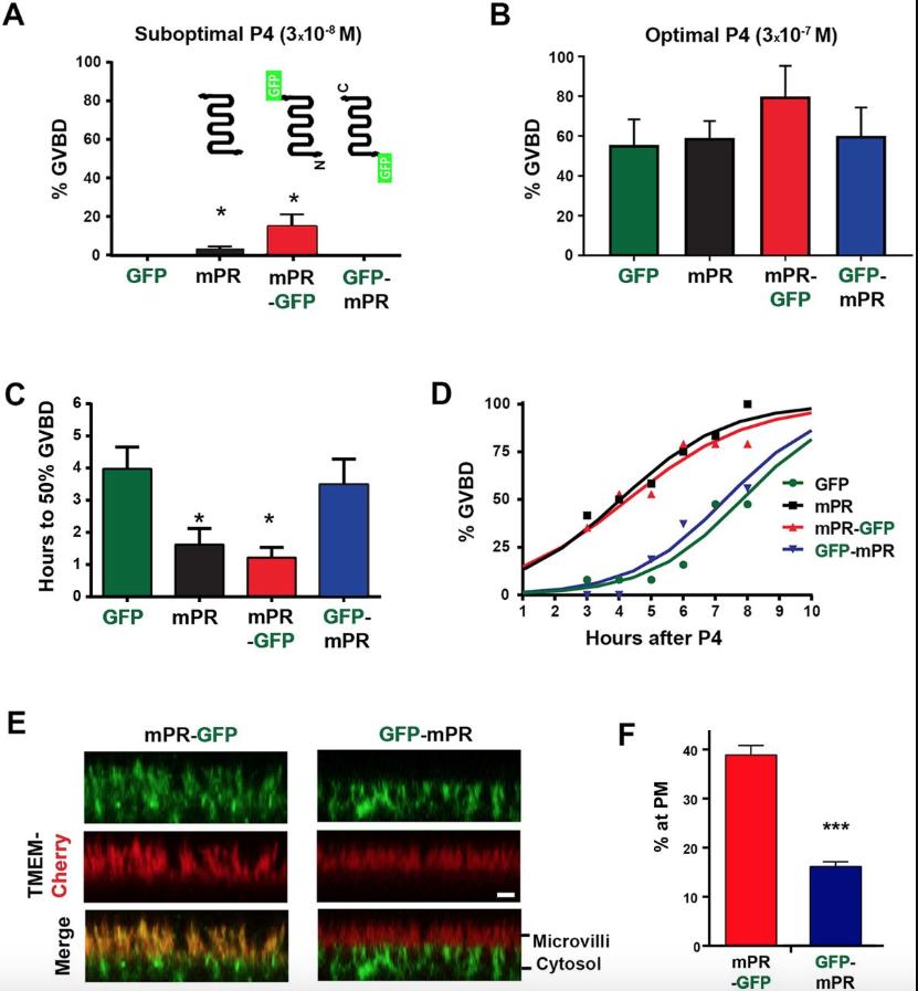 Figure 1. Functional characterization of GFP-tagged mPR. (A,B) Effect of mPR on oocyte maturation. Oocytes were injected with RNA coding for GFP, wild-type mPR (untagged), mPRâGFP (C-terminally tagged) or GFPâmPR (N-terminally tagged), and after 48â h, were treated with progesterone (P4) overnight at suboptimal (3Ã10â8 M) (A), or optimal (3Ã10â7 M) (B) concentrations. Oocyte maturation was scored â¼16â h after P4 treatment by the appearance of a white spot on the oocyte animal hemisphere, which is indicative of germinal vesicle breakdown (GVBD). (C) Time needed for 50% of the oocytes to reach GVBD after adding P4 (3Ã10â7 M) in the presence of overexpressed GFP, mPR, mPRâGFP or GFPâmPR as indicated. (D) Representative GVBD time courses in response to P4 (3Ã10â7 M) in oocytes overexpressing GFP, mPR, mPRâGFP or GFPâmPR as indicated. The data are normalized to the values in GFP-injected cells and a non-linear curve was fitted to the data. (E) Representative orthogonal sections from a confocal stack of images (see Fig. S1) taken 48â h after injecting RNAs encoding mPRâGFP or GFPâmPR along with the PM marker, TMEMâmCherry. Scale bar: 2â µm. (F) Histogram showing the percentage of mPRâGFP or GFPâmPR at the PM. Quantitative results in AâC and F are mean±s.e.m. for three or more experiments. *P<0.05; ***P<0.001.