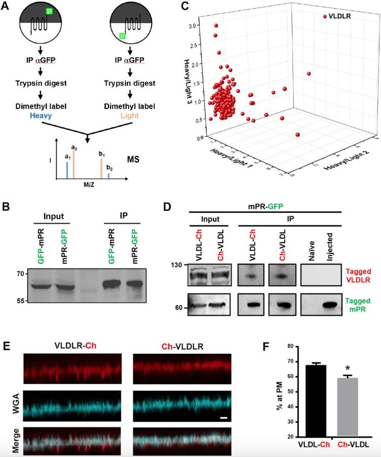 Figure 2. Identification of VLDLR as an mPR-interacting protein. (A) Illustration of the experimental design to identify proteins that selectively interact with the functional mPRâGFP construct. (B) Oocytes were injected with mPRâGFP or GFPâmPR RNAs and, 48â h later, lysates immunoprecipitated with anti-GFP magnetic microbeads. Whole-cell lysates (input) and eluates from the anti-GFP beads (IP) were examined by western blotting using an anti-GFP antibody. (C) Plot of the heavy:light ratios (mPRâGFP/GFPâmPR) from three separate mass spectrometry experiments showing the consistent enrichment of VLDLR in its selective interaction with mPRâGFP. (D) Oocytes were either uninjected (Naïve) or injected with RNA coding for the C-terminally tagged mPRâGFP alone (injected) or co-injected with either the N- (ChâVLDLR) or C-terminally (VLDLRâCh) mCherry-tagged VLDLR and allowed to express proteins for 48â h. After cross-linking, mPRâGFP was immunoprecipitated using anti-GFP magnetic microbeads. Fractions from the whole lysates (input) and the GFP-binding eluate (IP) were examined by western blotting using anti-GFP and anti-mCherry/anti-RFP antibodies. (E) Representative orthogonal sections of an oocyte stained with WGA and overexpressing VLDLRâmCherry or mCherryâVLDLR as indicated. Scale bar: 2â µm. (F) Histogram showing the percentage of VLDLRâmCherry or mCherryâVLDLR at the PM (mean±s.e.m. of 29 oocytes/condition). *P<0.05.
