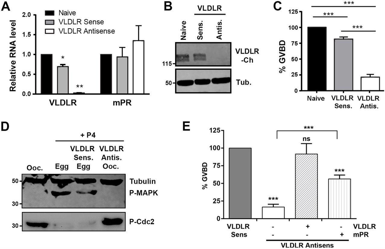 Figure 3. VLDLR is required for the release of oocyte meiotic arrest. (A) Knockdown of VLDLR expression. Oocytes were injected with VLDLR sense oligonucleotides, as a control, or the corresponding antisense oligonucleotides to knockdown VLDLR expression. RNA was prepared 48â h later and analyzed by qRT-PCR to determine the efficacy of the knockdown on VLDLR and mPR expression. Data are expressed as relative levels of VLDLR and mPR mRNA transcripts after normalizing to the levels of Xenopus ornithine decarboxylase (xODC) mRNA. Naïve, uninjected oocytes. (B) Naïve or VLDLRâmCherry-overexpressing oocytes were injected with VLDLR sense or antisense oligonucleotides and cell extracts were analyzed by western blotting using anti-mCherry antibodies 48â h later. Tubulin is shown as a loading control. (C) VLDLR is required for P4-dependent oocyte maturation. Oocytes were injected with VLDLR sense or antisense oligonucleotides and, 48â h later, incubated in P4-containing solution overnight. The percentage of oocytes that had undergone GVBD normalized to the naïve treatment is shown. (D) Western blot assessing the MAPKERK1/2 and Cdc2 phosphorylation state for the different treatments as indicated. Ooc. refers to immature oocytes before progesterone treatment and Egg to mature eggs. Tubulin is shown as a loading control. (E) VLDLR knockdown rescue. Oocytes were injected with VLDLR sense or antisense oligonucleotides in the presence or absence of untagged VLDLR (10â ng RNA/oocyte) or untagged mPR (10â ng RNA/oocyte) as indicated. P4 was added 48â h later and the percentage of oocytes undergoing GVBD was normalized to the GVDB recorded with VLDLR sense-injected oocytes. Quantitative results are mean±s.e.m. for three or more experiments. *P<0.05; **P<0.01; ***P<0.001.