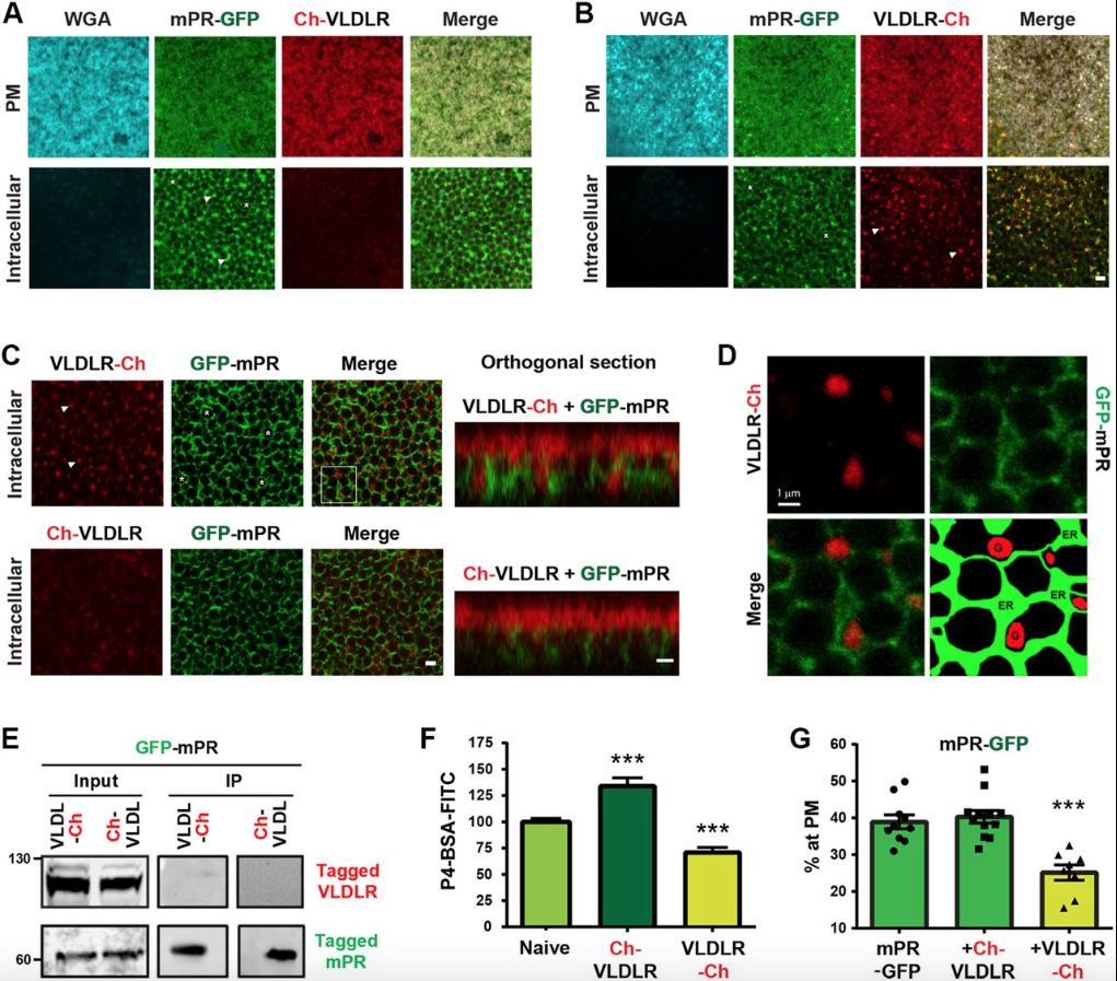 Figure 5. VLDLR is required for mPR trafficking. (A,B) Representative focal plane images of WGA-stained oocytes expressing mPRâGFP with mCherryâVLDLR (A) or VLDLRâmCherry (B). (C) Representative intracellular focal plane and orthogonal sections of oocytes overexpressing GFPâmPR with VLDLR tagged at its N- or C-terminus. The typical reticular ER structure surrounding pigment granules, which are indicated by stars in panels AâC, and the VLDLRâCh- or mPRâGFP-positive puncta representative of the Golgi are indicated by arrowheads. Scale bars: 2â µm. (D) Higher resolution view of the box indicated in the merge image in C to better highlight the VLDLR-positive Golgi structures and the reticular ER appearance indicated by the GFPâmPR staining. A cartoon rendering showing the ER and Golgi (labeled G) is shown in the bottom-right image. (E) Lack of physical interaction between the N-terminally tagged GFPâmPR and mCherry-tagged VLDLR. Oocytes were injected with RNA coding for GFPâmPR along with N- (ChâVDLDR) or C-terminally (VLDLRâCh) tagged VLDLR and allowed to express for 48â h. This was followed by crosslinking, lysing and immunoprecipitation using anti-GFP magnetic microbeads. Fractions from the whole lysates (input) and eluates from the anti-GFP beads (IP) were examined by western blotting using anti-GFP, anti-mCherry and anti-RFP antibodies. (F) Quantification of endogenous mPR PM residence in the presence of overexpressed VLDLR. Oocytes were injected with VLDLRâCh or ChâVLDLR RNA and stained with P4âBSAâFITC 48â h later. Data were normalized to the average P4âBSAâFITC fluorescence in naïve (uninjected) oocytes. (G) Quantification of mPR-GFP at the PM following expression of mPR-GFP alone or with mCherry-VLDLR or VLDLR-mCherry as indicated. Oocytes were stained with WGA and confocal z-stacks taken 48â h later. Quantitative results are mean±s.e.m. for three or more experiments or as indicated by individual data points. ***P<0.001.