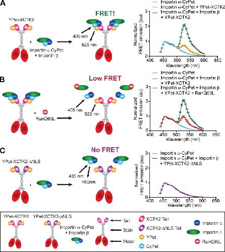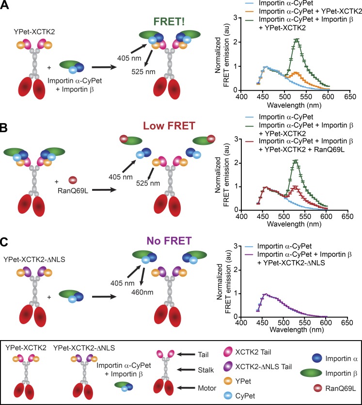 Figure 1. FRET biosensors recapitulate Ran-regulated association of XCTK2 and importin α/β. (AâC) Schematic (left) and solution-based FRET assay (right) of importin α-CyPet with YPet-XCTK2 ± importin β (A) ± RanQ69L (B) or YPet-XCTK2-ÎNLS + importin β (C). The normalized FRET ratios are graphed as the mean ± SEM from 440 to 600 nm (n = 3 independent experiments). |