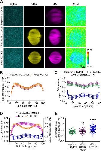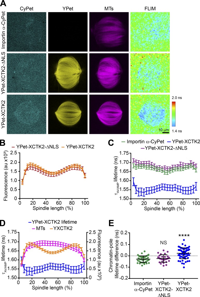 Figure 2. XCTK2 forms a gradient of association with importin α/β from the poles to the chromatin. (A) Representative confocal fluorescence (CyPet, YPet, and MTs) and lifetime (FLIM) images of importin α-CyPet + nontagged XCTK2 (importin α-CyPet), importin α-CyPet + YPet-XCTK2-ÎNLS, and importin α-CyPet + YPet-XCTK2 spindle assembly reactions. Scale bar: 10 µm. (B) YPet fluorescence line scans of spindles assembled in A of importin α-CyPet with YPet-XCTK2-ÎNLS or YPet-XCTK2 normalized to percentage of spindle length (25 bins). YPet fluorescence percentage spindle length is graphed as the mean ± SEM (n = 30 YPet-XCTK2-ÎNLS + importin α-CyPet and 58 YPet-XCTK2 + importin α-CyPet spindles from three independent experiments). (C) Lifetime line scans of spindles imaged in A and B, where lifetimes are represented as the amplitude averaged lifetime (ÏAV/AMP), and lifetimes per normalized percentage spindle length are graphed as the mean ± SEM (n = 38 importin α-CyPet + XCTK2 spindles, 30 YPet-XCTK2-ÎNLS + importin α-CyPet, and 58 YPet-XCTK2 + importin α-CyPet spindles). (D) Line scans of the lifetimes from spindles with YPet-XCTK2 + importin α-CyPet relative to the fluorescence of the spindle MTs and the YPet fluorescence plotted as in B and C. (E) Chromatin and pole lifetime differences for each spindle analyzed in C with the mean ± SD indicated (DâAgostino and Pearson normality test and BrownâForsytheâs and Welchâs with Dunnettâs multiple comparisons test: ****, P < 0.0001). |