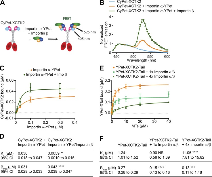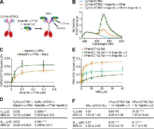 Figure S1. XCTK2 tail MT binding is tunable by importin α/β association. (A) Schematic of FRET biosensors to detect XCTK2 and importin α/β association where XCTK2 is N-terminally tagged with CyPet (CyPet-XCTK2) and importin α is C-terminally tagged with YPet (importin α-YPet). (B) Solution-based FRET assay of CyPet-XCTK2 with importin α-YPet ± importin β. The normalized FRET ratios are graphed as mean ± SEM from 440 to 600 nm (n = 4â5 independent experiments). (C and D) Affinity assays of CyPet-XCTK2 with importin α-YPet ± importin β. The mean ± SD of CyPet-XCTK2 bound for each importin α-YPet concentration and the best-fit quadratic binding curves are graphed from C with the binding data summarized in D (n = 4â5 independent experiments; extra sum-of-squares F test compared with CyPet-XCTK2 + importin α-YPet: Kd, P = 0.0088; Bmax, P < 0.0001). CyPet-XCTK2 bound is graphed from 0 to 0.3 µM importin α-YPet, excluding 1 and 2.5 µM importin α-YPet data points. (E and F) MT affinity assays of YPet-XCTK2-Tail in the absence and presence of equimolar (1Ã) or fourfold excess (4Ã) of importin α/β. The amount of YPet-XCTK2-Tail bound is plotted as the mean ± SD for each MT concentration, and the best-fit quadratic binding curves are graphed (E) with the binding data summarized in F (n = 5â8 independent experiments; extra sum-of-squares F test compared with YPet-XCTK2-Tail alone: YPet-XCTK2-Tail + 1à importin α/β, Kd, NS; Bmax, P < 0.0001; YPet-XCTK2-Tail + 4à importin α/β, Kd, P < 0.0001; P = 0.0002). (D and F) **, P < 0.01; ***, P < 0.001; ****, P < 0.0001. |