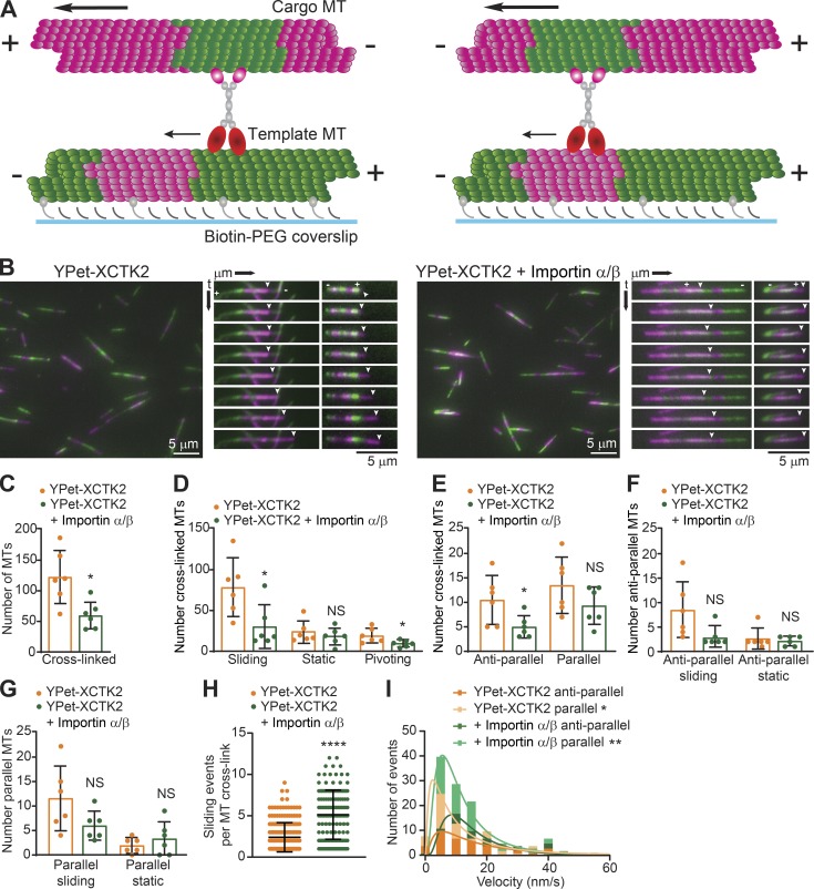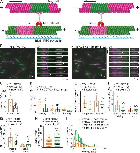 Figure 3. Importin α/β inhibit XCTK2 antiparallel MT cross-linking and sliding. (A) Schematic of XCTK2 antiparallel (left) and parallel (right) MT cross-linking and sliding assay with segmented MTs. (B) Representative images and kymographs of MT cross-linking and sliding with YPet-XCTK2 (left; Video 1) or YPet-XCTK2 with 4â8 molar excess of importin α/β (right; Video 2). The template MT minus (â) and plus (+) ends are indicated on the top kymograph image, and the sliding cargo MT plus end is indicated by an arrowhead. The YPet-XCTK2 kymograph images increment by 30-s intervals, and the YPet-XCTK2 + importin α/β increment by 75-s intervals to illustrate the multiple events over the course of the time lapse. Scale bars: 5 µm. (CâG) Quantification of the indicated conditions plotted as the number of cross-links per experiment, with the mean ± SD indicated as a bar graph, with the dots representing the values of individual experiments (n = 729 YPet-XCTK2 and 352 YPet-XCTK2 + importin α/β cross-linked MTs, n = 63 YPet-XCTK2 and 31 YPet-XCTK2 + importin α/β antiparallel cross-links, n = 81 YPet-XCTK2 and 56 YPet-XCTK2 + importin α/β parallel cross-links from six independent experiments; F test to compare variances and two-tailed Studentâs or Welchâs t tests were performed: *, P < 0.05). (H) The number of sliding events per MT cross-link is graphed with the mean ± SD (n = 212 YPet-XCTK2 and 140 YPet-XCTK2 + importin α/β cross-links from three independent experiments; DâAgostino and Pearson normality and log-normal tests and two-tailed MannâWhitney t test: ****, P < 0.0001). (I) Velocity of MT sliding events for antiparallel and parallel MT cross-links is graphed as a frequency histogram with the best-fit log Gaussian curve (n = 42 YPet-XCTK2 antiparallel and 71 parallel events, and n = 60 YPet-XCTK2 + importin α/β antiparallel and 116 parallel events from three independent experiments; DâAgostino and Pearson log-normal test and extra sum-of-squares F test to compare geometric means of the log Gaussian distribution of events: XCTK2 antiparallel versus parallel, *, P = 0.0362; XCTK2 + importin α/β antiparallel versus parallel, **, P = 0.0050). The frequency histogram is graphed up to 60 nm/s, excluding a single point at 120 nm/s. |