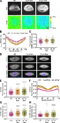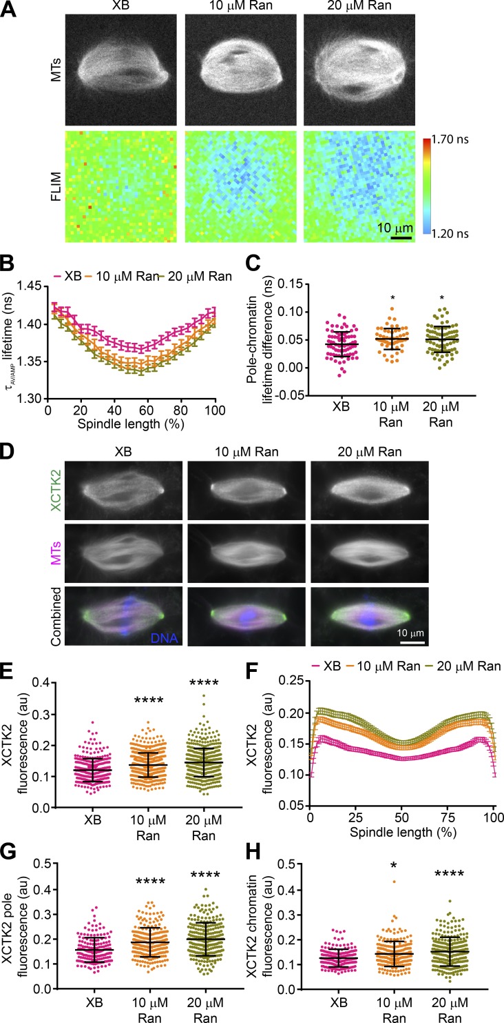 Figure 4. The RanGTP gradient promotes global and local targeting of XCTK2 within the spindle. (A) Representative MT confocal and Rango-2 FLIM images of spindles assembled with XB control buffer, 10 µM Ran, or 20 µM Ran addition. Lifetimes are represented as the amplitude averaged lifetime (ÏAV/AMP). (B) Line scans from pole to pole of the spindle lifetime images for the indicated conditions normalized for percent spindle length (25 bins). Lifetimes per spindle length are graphed as the mean ± SEM (n = 57â78 spindles per condition from three to four independent experiments). (C) Lifetime difference between the pole and chromatin regions for each spindle in each condition from B (DâAgostino and Pearson normality test and one-way ANOVA with Tukeyâs multiple comparisons test compared with XB control: *, P < 0.05). (D) Representative wide-field fluorescence microscopy images of spindle assembly reactions from parallel experiments with XB control buffer or with added Ran that were stained with α-XCTK2. (E) Spindles from D were analyzed using a Cell Profiler pipeline that measured the mean total XCTK2 spindle fluorescence based on α-XCTK2 staining in the indicated conditions and plotted with the mean ± SD (n = 314â564 spindles per condition from five independent experiments). (F) Line scans of bipolar spindles from D were performed, normalized for percentage spindle length (101 bins), and graphed as the mean ± SEM (n = 168â248 spindles per condition from four independent experiments). (G) XCTK2 peak pole fluorescence plotted as the average fluorescence from the two poles per spindle analyzed in F. (H) XCTK2 chromatin fluorescence plotted as the center spindle position for each spindle analyzed in F. In G and H, the mean ± SD is indicated. (EâH) DâAgostino and Pearson normality tests and KruskalâWallis with Dunnâs multiple comparisons tests compared with XB control were performed: *, P < 0.05; ****, P < 0.0001. Scale bars: 10 µm. |