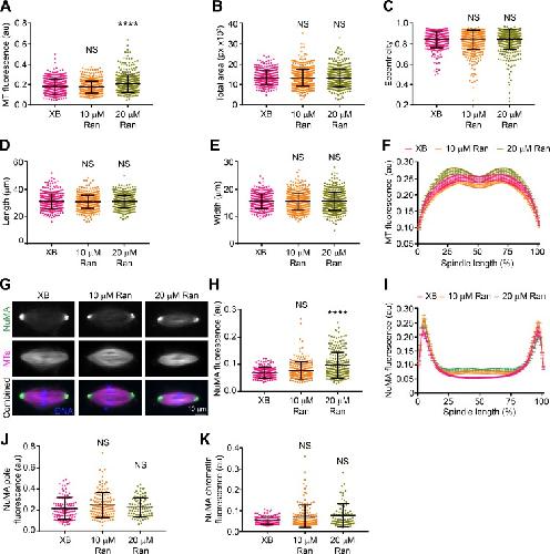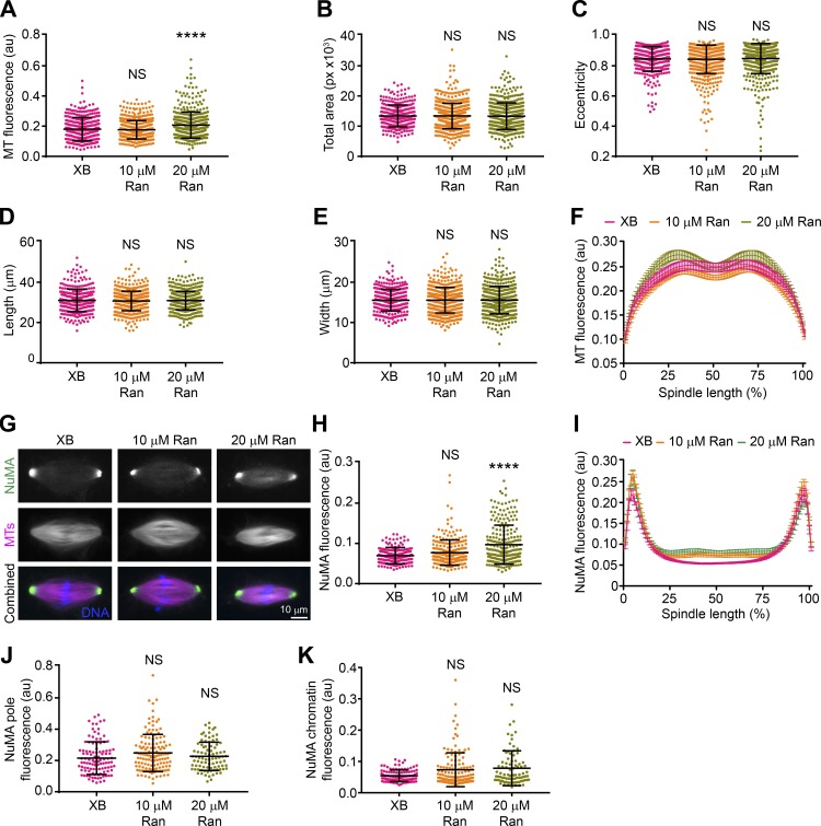 Figure S2. Enhancing the RanGTP gradient does not change spindle morphology or NuMA localization. (AâE) Spindle morphology analysis with Cell Profiler of spindles measured in Fig. 4 D and graphed with the mean ± SD (n = 314â564 spindles per condition from four to five independent experiments; DâAgostino and Pearson normality and KruskalâWallis with Dunnâs multiple comparisons tests were performed, and statistical significance is compared with XB control buffer: ****, P < 0.0001). (F) Line scan analysis of MT polymer distribution of spindles analyzed in Fig. 4 F graphed as the mean ± SEM. (G) Representative wide-field fluorescence microscopy images of spindle assembly reactions with XB control buffer, 10 µM Ran, or 20 µM Ran addition stained with α-NuMA that were performed in parallel to those in Fig. 4. Scale bar: 10 µm. (H) Total α-NuMA fluorescence of spindles assembled in G and plotted with the mean ± SD (n = 209â240 spindles per condition from four independent experiments; DâAgostino and Pearson normality and KruskalâWallis with Dunnâs multiple comparisons tests were performed compared with XB control buffer: ****, P < 0.0001). (I) Line scan analysis of bipolar spindles analyzed in G, normalized for percentage spindle length (101 bins), and graphed as the mean ± SEM (n = 86â134 spindles per condition from four independent experiments). (J and K) NuMA peak pole and chromatin fluorescence as calculated in Fig. 4 (G and H) and plotted with the mean ± SD (DâAgostino and Pearson normality and KruskalâWallis with Dunnâs multiple comparisons tests were performed compared with XB buffer control: NS). |