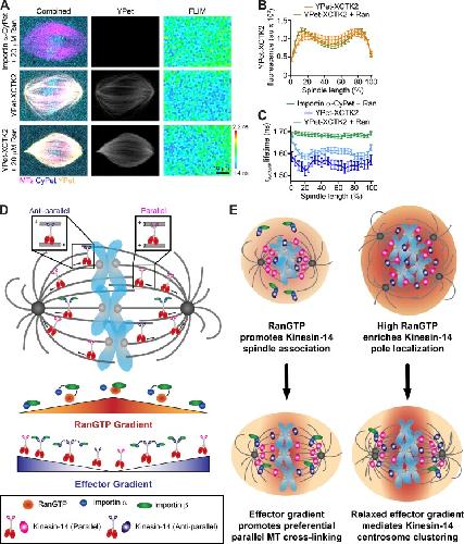 Figure 5. The RanGTP gradient generates an effector gradient of Kinesin-14s for preferential parallel MT cross-linking and sliding near the spindle poles. (A) Representative confocal fluorescence (CyPet, YPet, and MT) and lifetime (FLIM) images of spindles assembled with importin α-CyPet + nontagged XCTK2 + Ran (importin α-CyPet + 20 µM Ran), importin α-CyPet + YPet-XCTK2, or importin α-CyPet + YPet-XCTK2 + 20 µM Ran). Scale bar: 10 µm. (B) YPet fluorescence line scans of spindles assembled in A of importin α-CyPet with YPet-XCTK2 ± Ran normalized to percentage spindle length (25 bins) and graphed as the mean ± SEM (n = 60 YPet-XCTK2 and 97 YPet-XCTK2 + Ran spindles from four to five independent experiments). (C) Lifetime line scans of spindles imaged in A where lifetimes are represented as the amplitude averaged lifetime (ÏAV/AMP), and lifetimes per percentage of spindle length are graphed as the mean ± SEM (n = 68 importin α-CyPet + XCTK2 + Ran spindles, 27 importin α-CyPet + YPet-XCTK2, and 52 importin α-CyPet + YPet-XCTK2 + Ran spindles from four to five independent experiments). (D) XCTK2 cross-links and slides both antiparallel and parallel MTs near the chromatin where RanGTP is high and the association with importin α/β is low. Near the spindle poles where RanGTP is low, importin α/β can bind to the XCTK2 tail and can selectively inhibit XCTK2 antiparallel MT cross-linking. Thus, the RanGTP gradient sets up an opposing effector gradient of importin α/β association with XCTK2 that promotes pole focusing through preferential parallel MT cross-linking and sliding near the poles. (E) In cancer cells with centrosome amplification and high RanGTP, we propose that heightened RanGTP increases Kinesin-14 association to the spindle and that the RanGTP gradient biases Kinesin-14 localization toward the spindle poles, where reduced importin α/β association sets up an effector gradient of increased Kinesin-14 cross-linking and sliding activity that mediates centrosome clustering for cancer cell survival. |