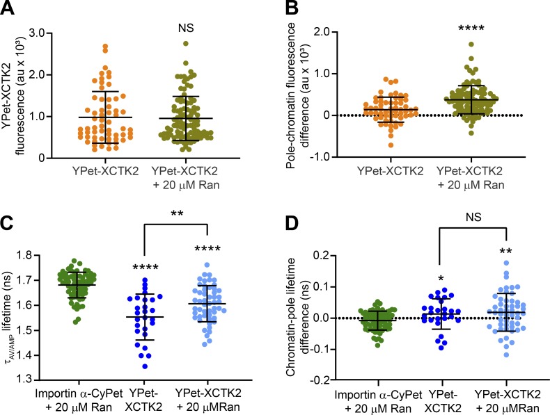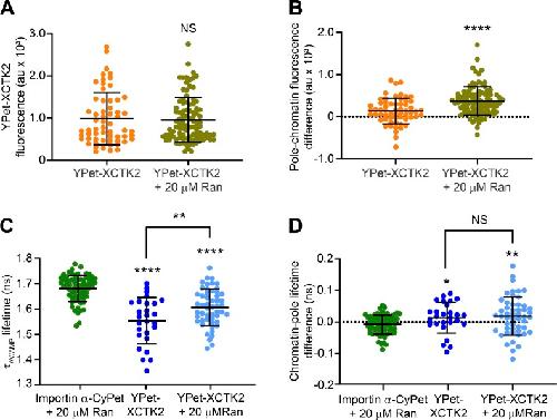 Figure S3. Enhancing the RanGTP gradient decreases the association of XCTK2 with importin α/β without affecting the steepness of the effector gradient. (A) YPet-XCTK2 mean fluorescence across the spindle ± Ran from spindles imaged in Fig. 5 A, calculated from the line scans performed in Fig. 5 B, and graphed with the mean ± SD (n = 60 YPet-XCTK2 spindles and 97 YPet-XCTK2 + Ran spindles from four to five independent experiments; DâAgostino and Pearson normality test and two-tailed MannâWhitney t test were performed: NS). (B) YPet-XCTK2 fluorescence difference between the pole and chromatin regions ± Ran for each spindle line scan in Fig. 5 B and graphed with the mean ± SD (DâAgostino and Pearson normality test and two-tailed MannâWhitney t test were performed: ****, P < 0.0001). (C) Mean line scan lifetime across the spindles of importin α-CyPet ± YPet-XCTK2 ± Ran calculated from the line scans performed in Fig. 5 C and graphed with the mean ± SD (n = 68 importin α-CyPet + Ran spindles, 27 YPet-XCTK2 + importin α-CyPet spindles, and 52 YPet-XCTK2 + Ran + importin α-CyPet spindles from four to five independent experiments; DâAgostino and Pearson normality tests, F tests to compare variances, MannâWhitney t tests compared with importin α-CyPet + Ran control and a Studentâs t test between YPet-XCTK2 and YPet-XCTK2 + Ran were performed: ****, P < 0.0001; **, P < 0.01). (D) Lifetime difference between the pole and chromatin regions for each spindle from Fig. 5 C and graphed ± SD (DâAgostino and Pearson normality tests, F tests to compare variances, Welchâs t test compared with importin α-CyPet + Ran control, and Studentâs t test between YPet-XCTK2 and YPet-XCTK2 + Ran were performed: *, P < 0.05; **, P < 0.01). |