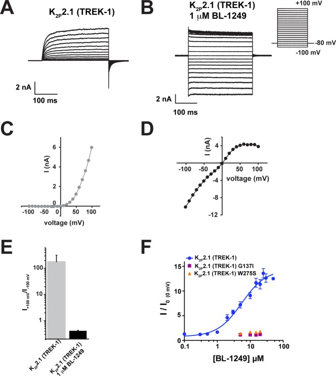 relationships for (C) K2P2.1(TREK-1) and (D) K2P2.1(TREK-1) with 1 μM BL-1249. (E) Rectification coefficients