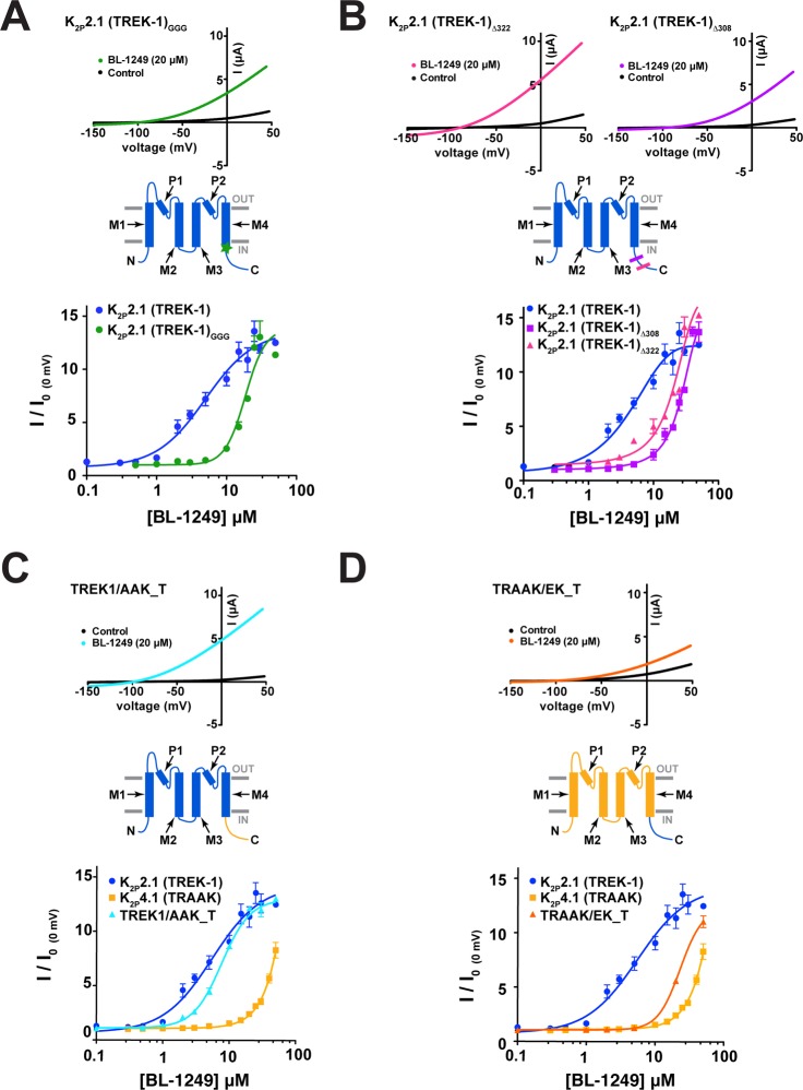 site of GGG mutation. (B) Exemplar current traces for K2P2.1(TREK-1)μ322 (magenta) and K2P2.1(TREK-1)μ308 (purple) with 20 μM BL-1249 and BL-1249 dose–response