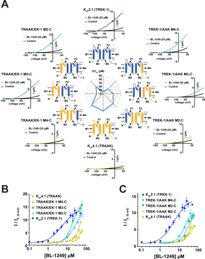 (C) BL-1249 dose–response curves for K2P2.1(TREK-1)
