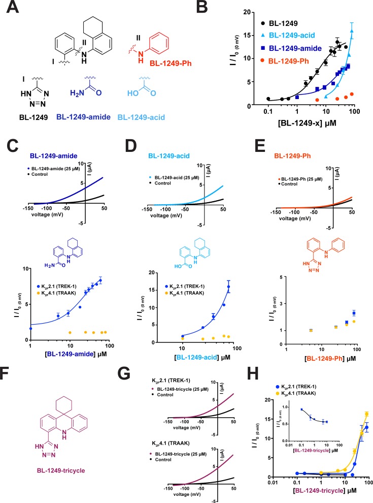 (G) Exemplar current traces for K2P2.1(TREK-1) and K2P4.1(TRAAK) with 25 μM BL-1249-tricycle (purple). (H)